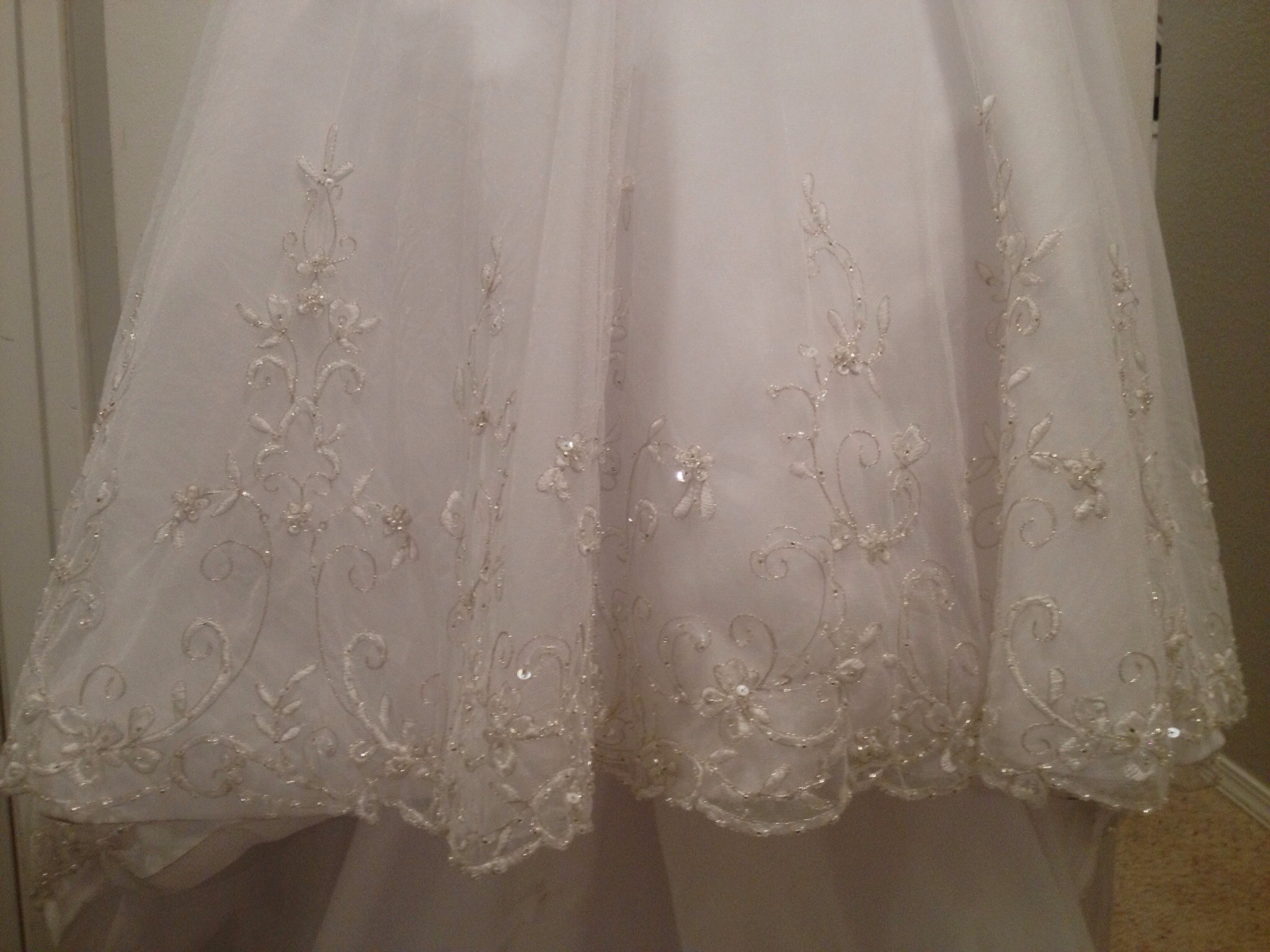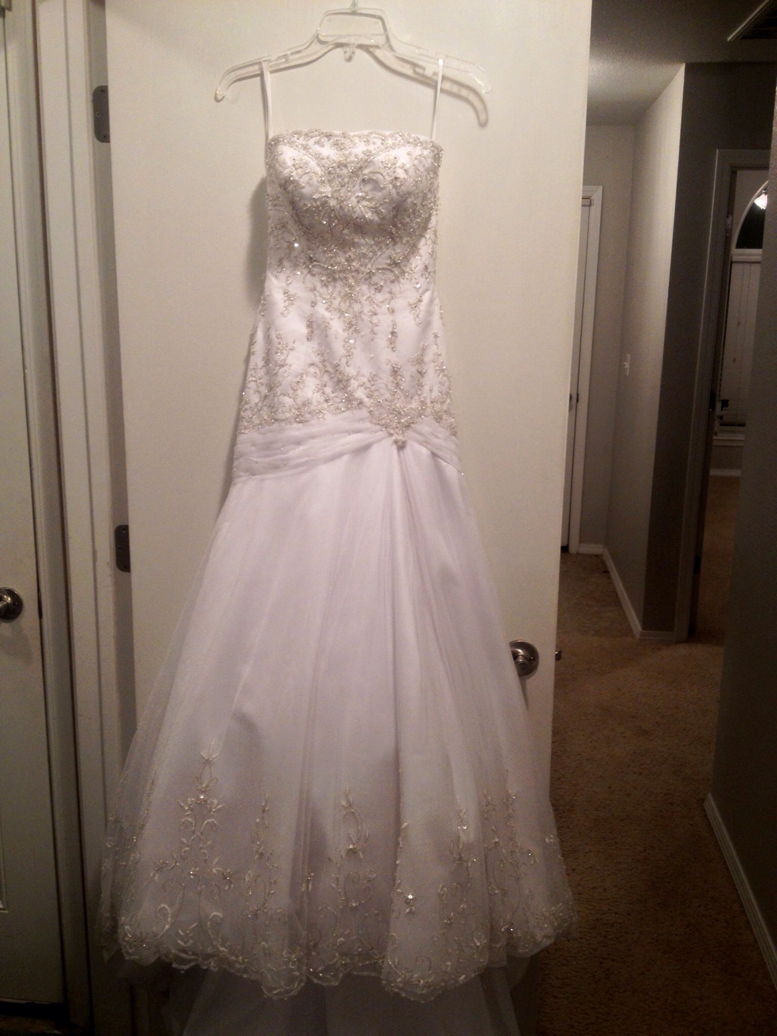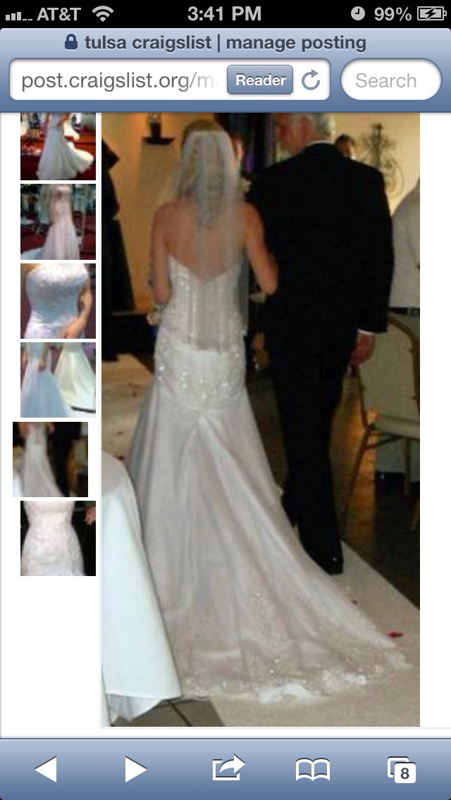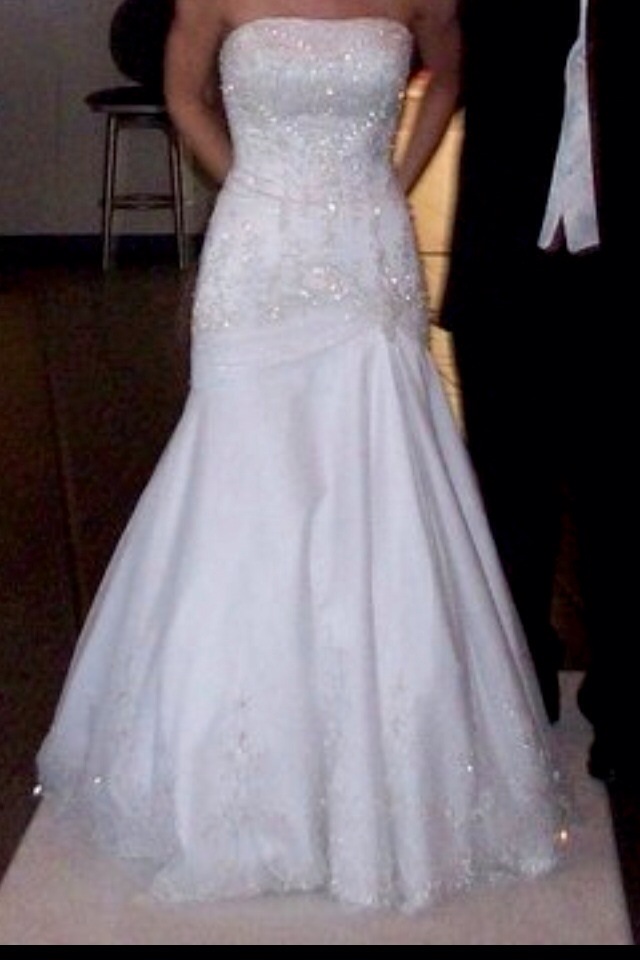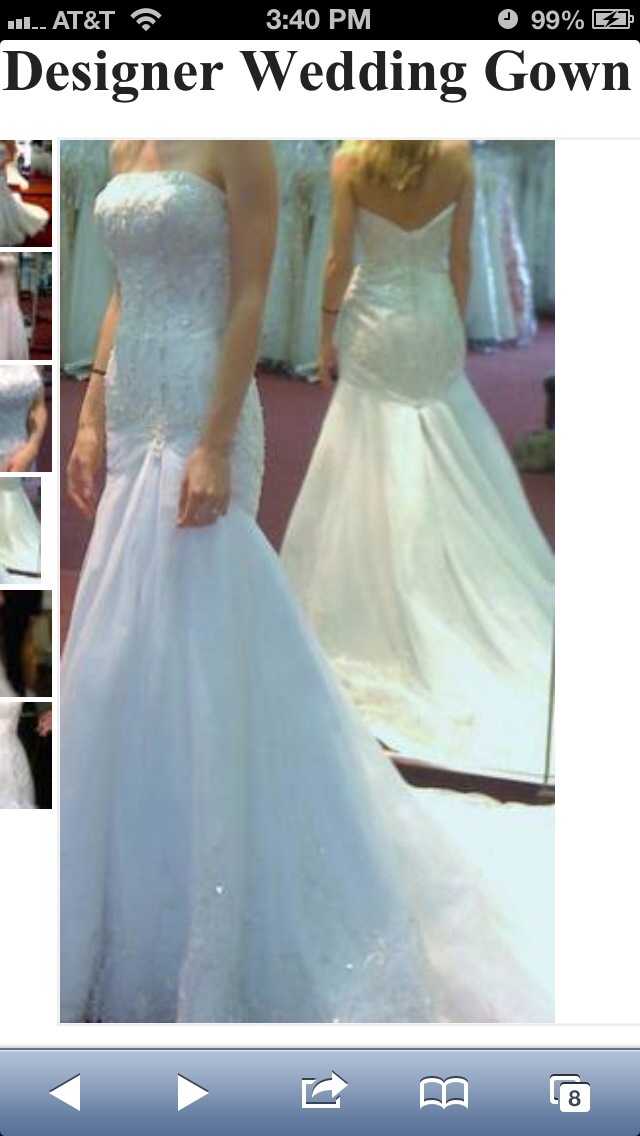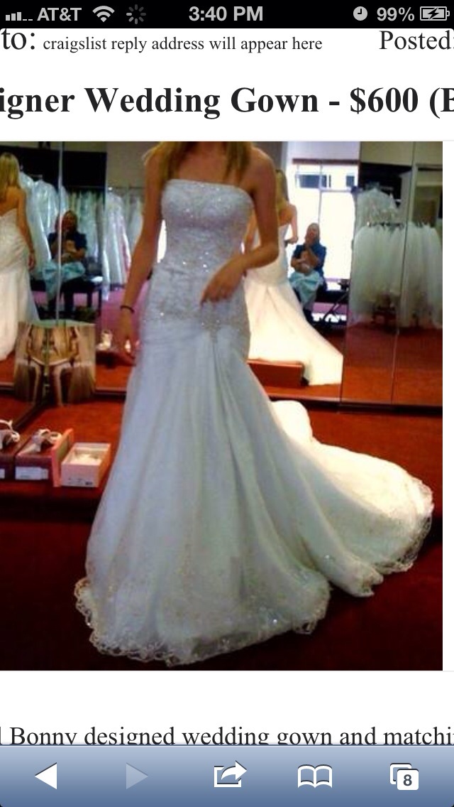 Beautiful Bonny designed wedding gown and matching veil with silver threading and intricate bead work. Scalloped edges around the base dress and long train. Size petitie 0, 5'3, 105lbs. 32D Must sale!! Asking $400 or best offer. Originally paid $1500