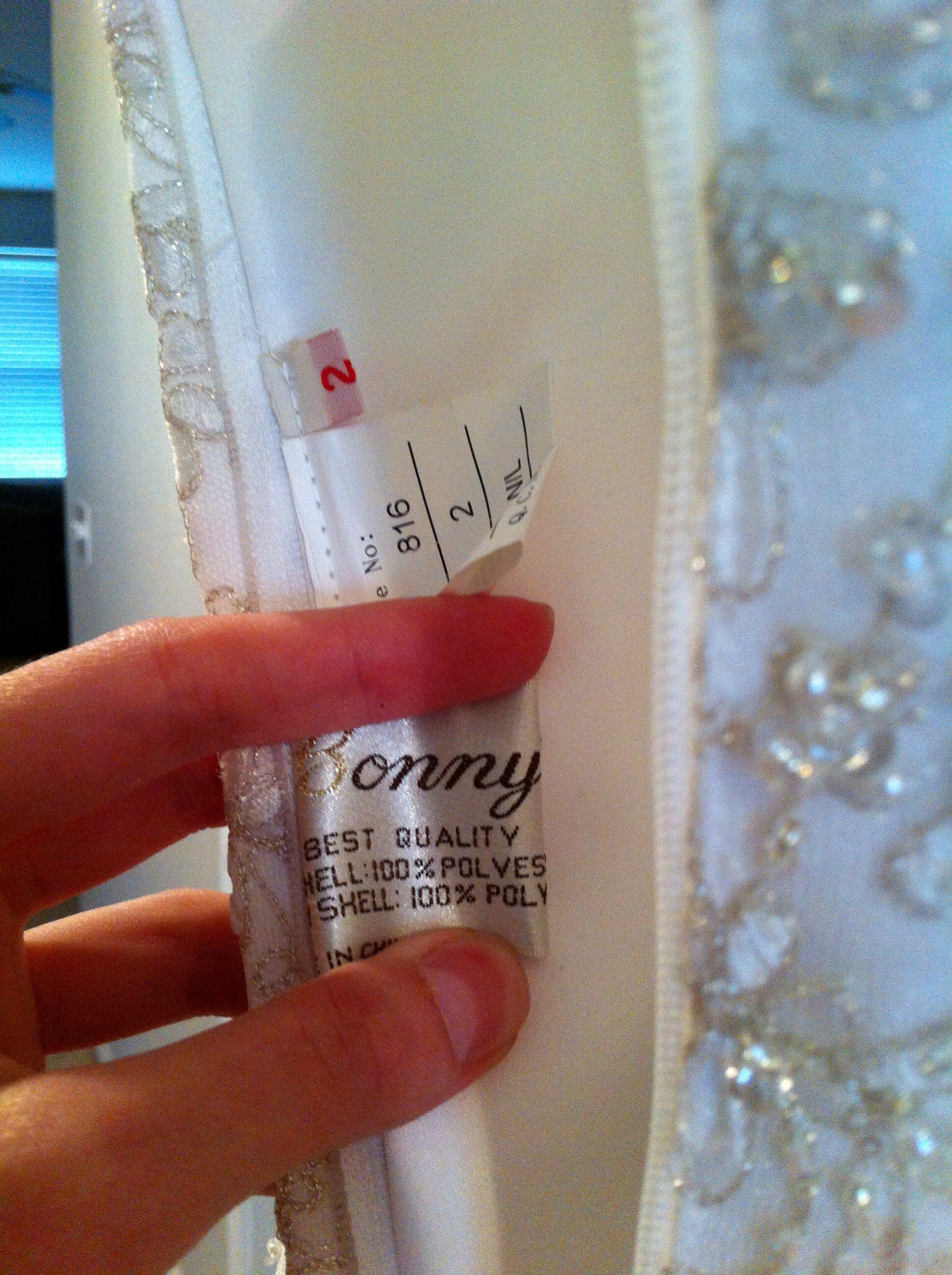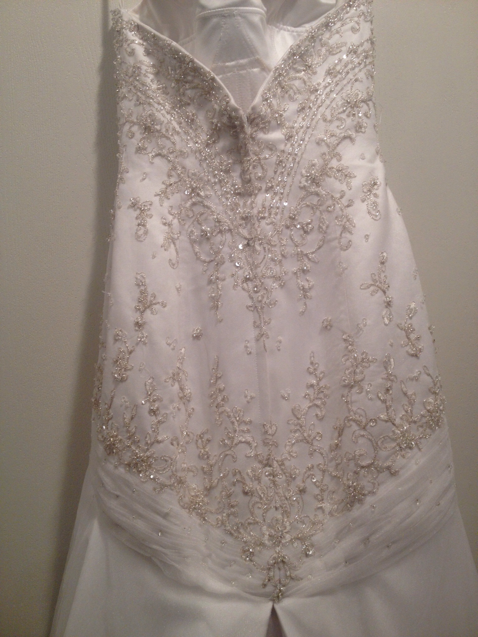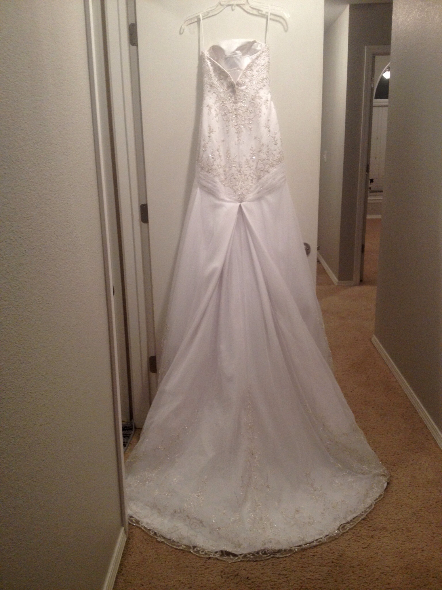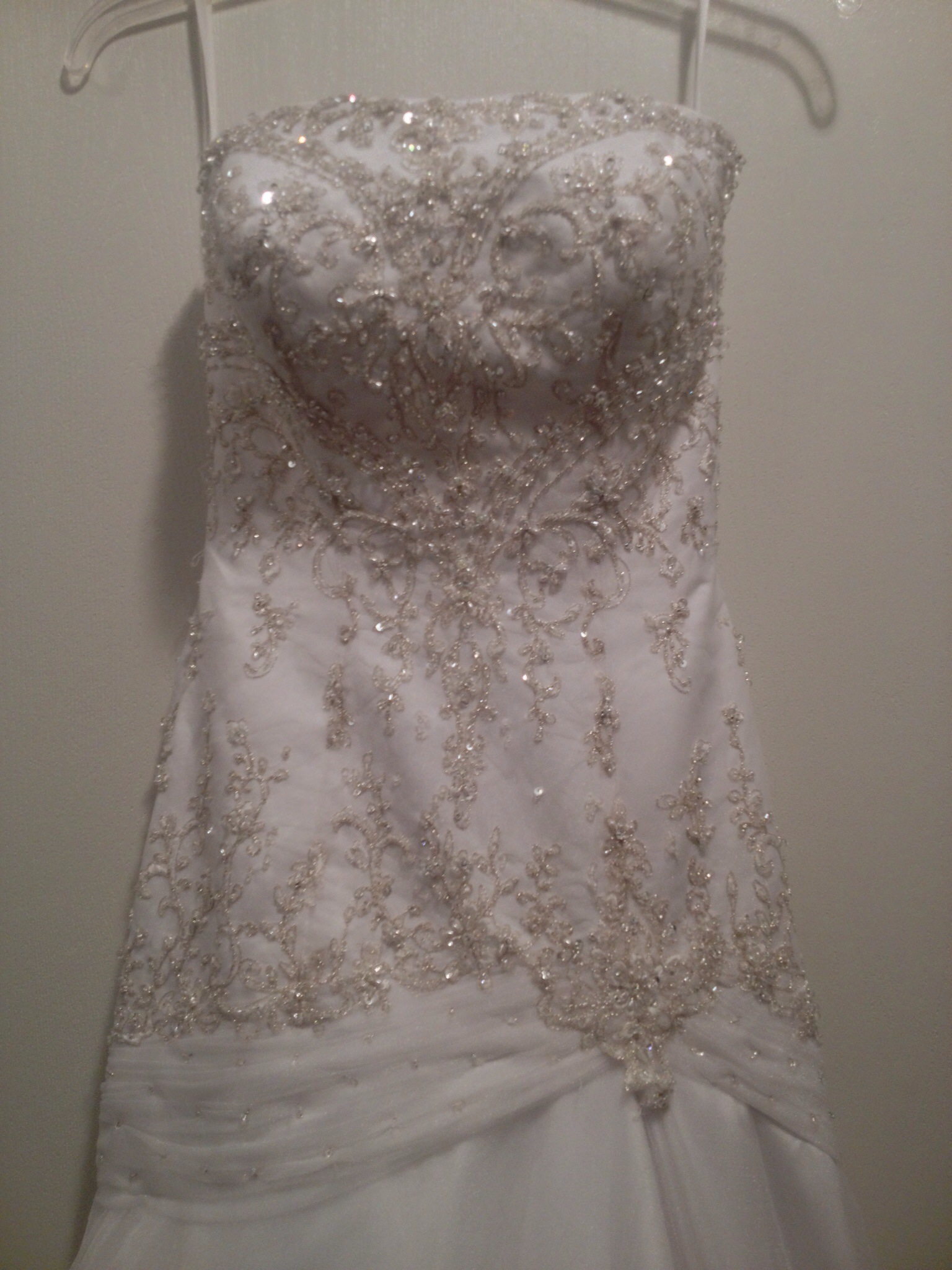 Beautiful Bonny designed wedding gown and matching veil with silver threading and intricate bead work. Scalloped edges around the base dress and long train. Size petitie 0, 5'3, 105lbs. 32D Must sale!! Asking $400 or best offer. Originally paid $1500
