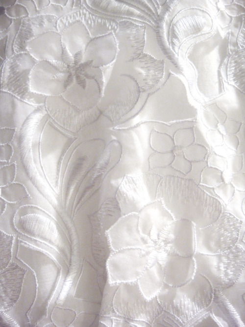 Embroidered scalloped overlay with floral appliques