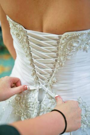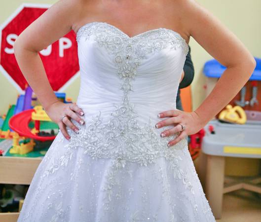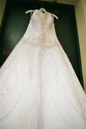 An gently used Allure Tulle and organza ball gown style skirt that I purchased from The Wedding Shoppe for my wedding that was this past May. It has a fitted bodice with a sweetheart neckline. Embellishments with crystals and embroidery and a lace up back that flows into a stunning train. The dress is a size 14 in a bright white color. It also comes with a matching shear glitter finger-tip length veil that looks beautiful with the dress and is very light in weight. Original price of the dress was $1200.00 and am looking to sell it for about $800.00 OBO. Feel free to contact me with any questions and if you would like pictures. Thanks!