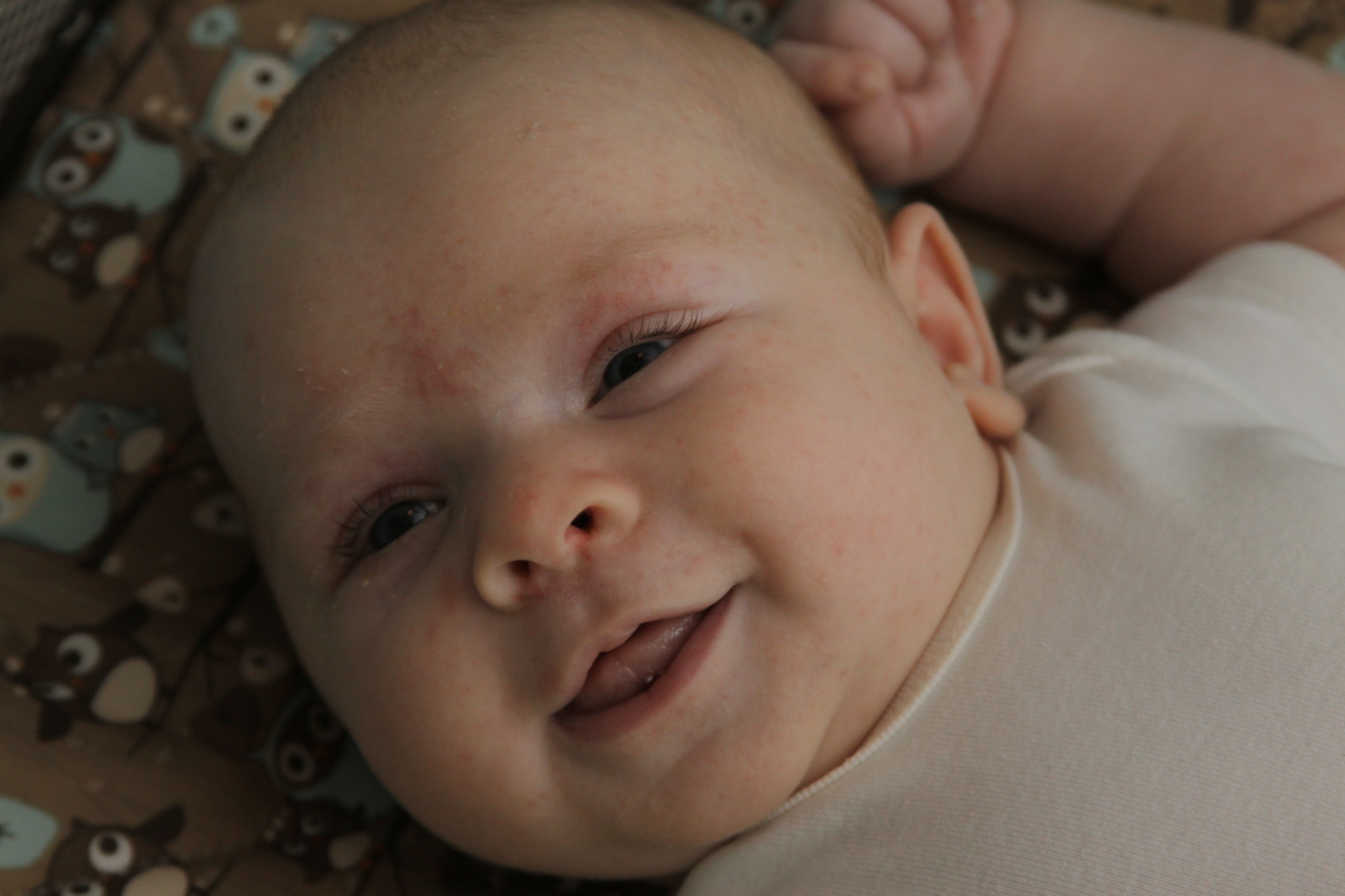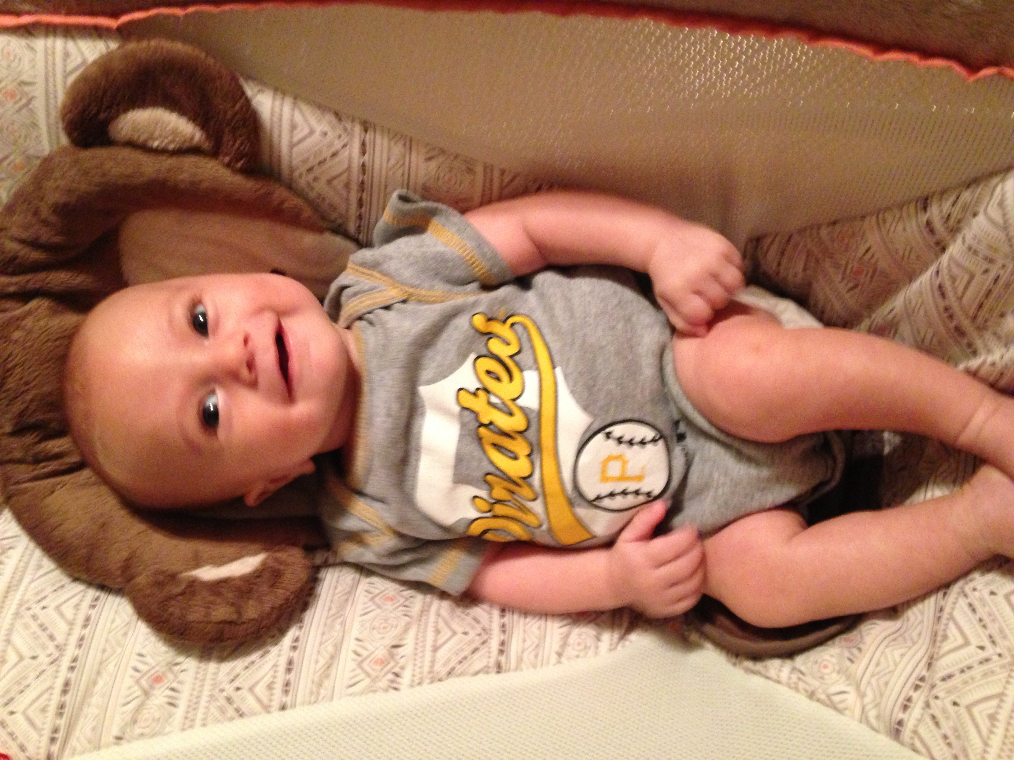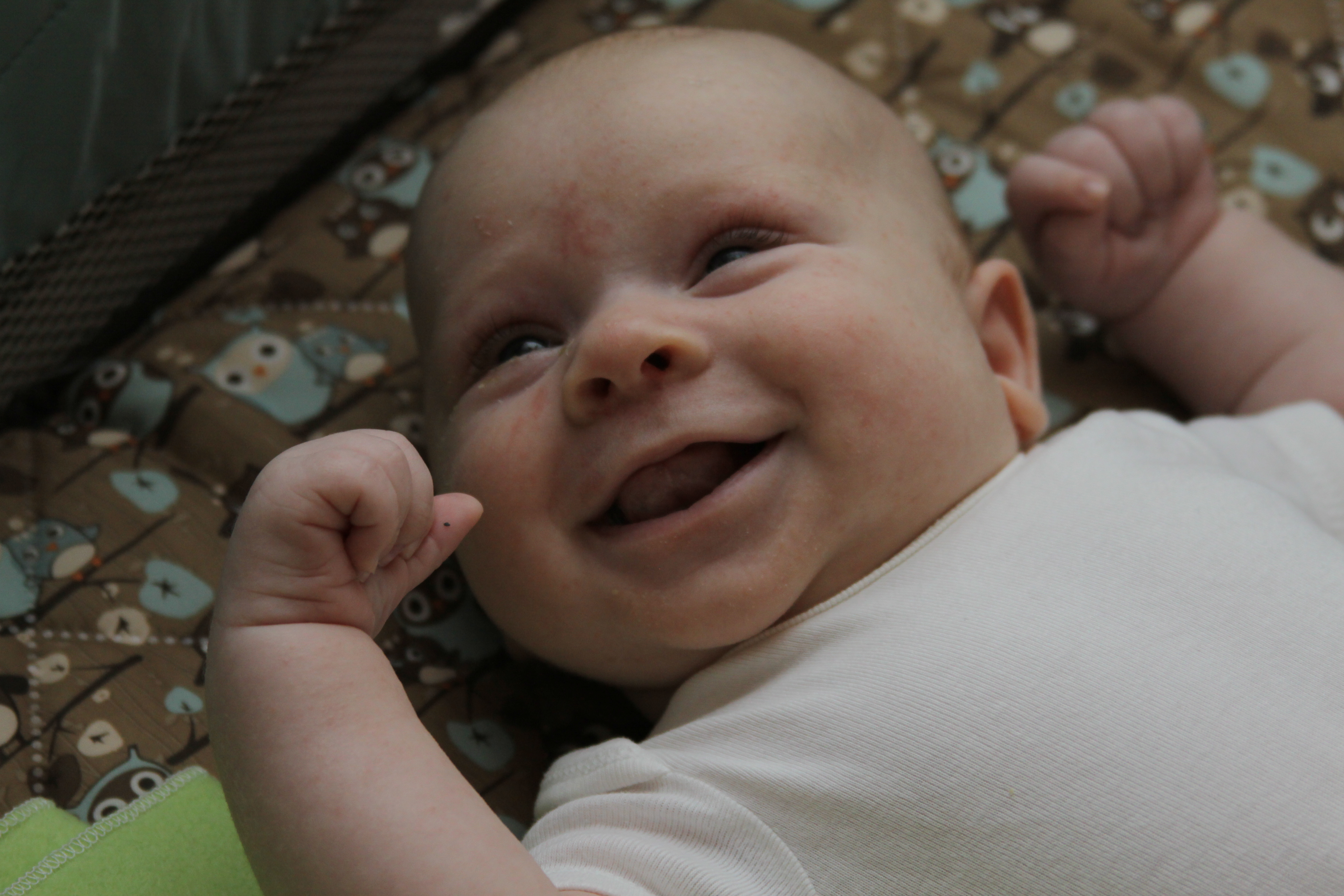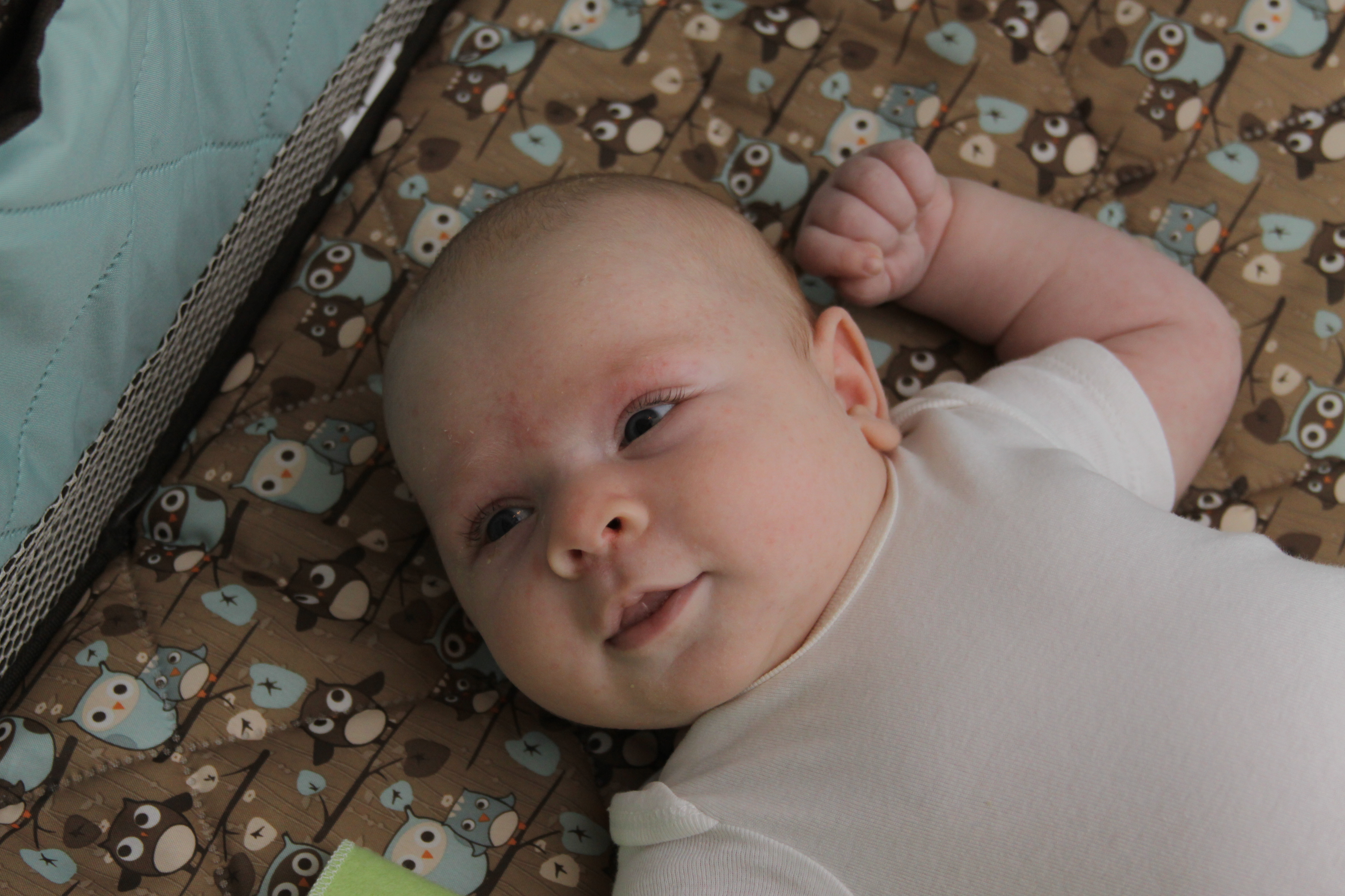 Here's Zack this morning cooing and smiling at his owl mobile. Doesn't look like the shots yesterday were too traumatic for him. And at 8 weeks he is a monster - 14 lbs 5 oz and 23 3/4 in long already! My little guy is growing way too fast!