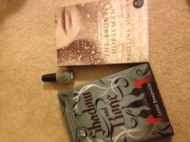 If you can't see the pic, she sent me Shadow and Bone and The Bronze Horseman and a fun fall light gray OPI nail polish.