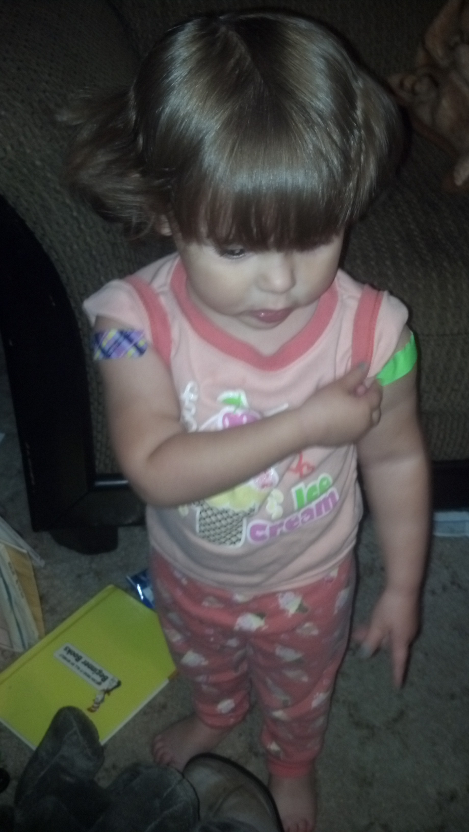 • A picture of her big girl band aids! She got 4 shots in her arms for the first time and she got bandaids for the first time!