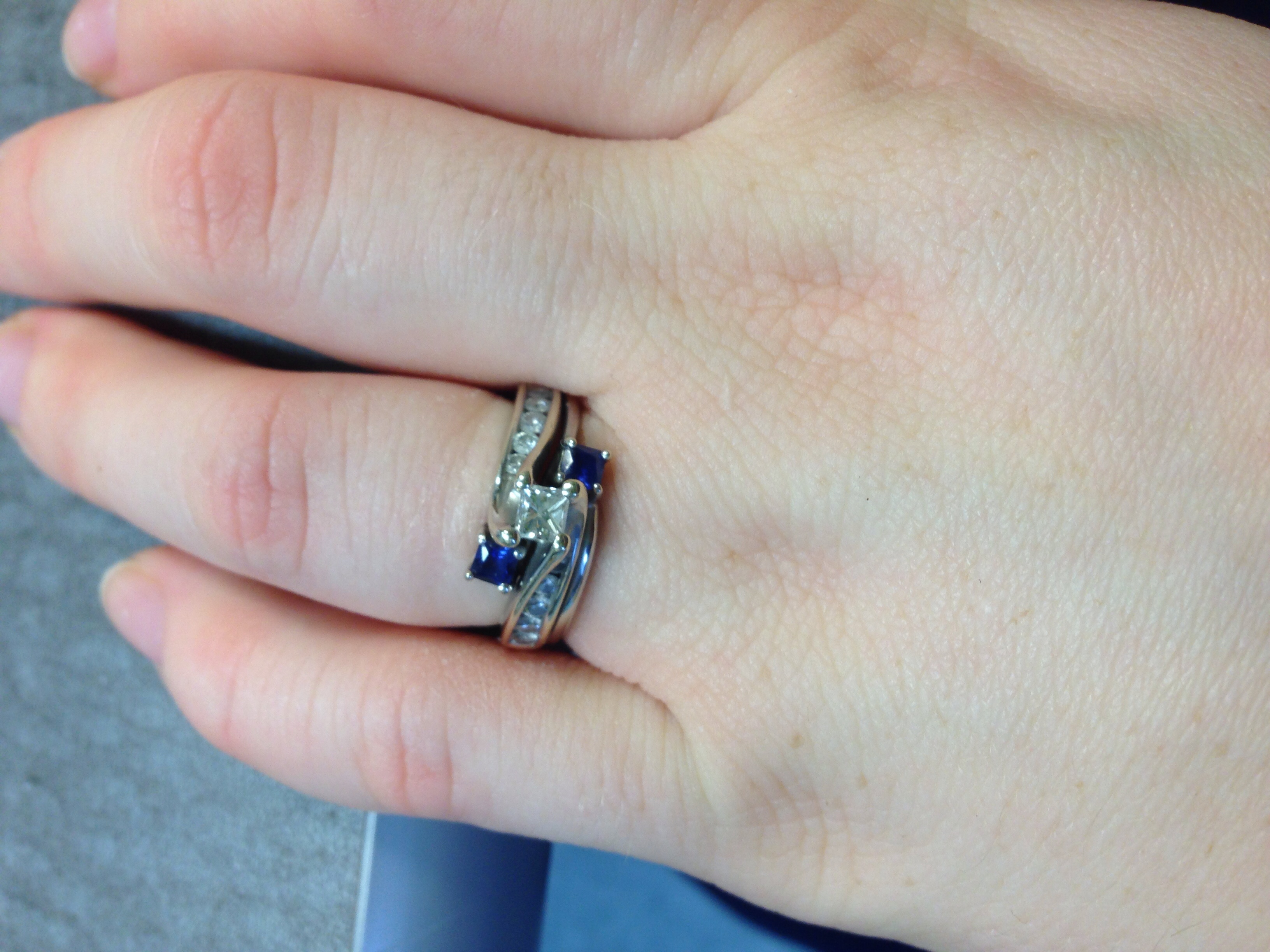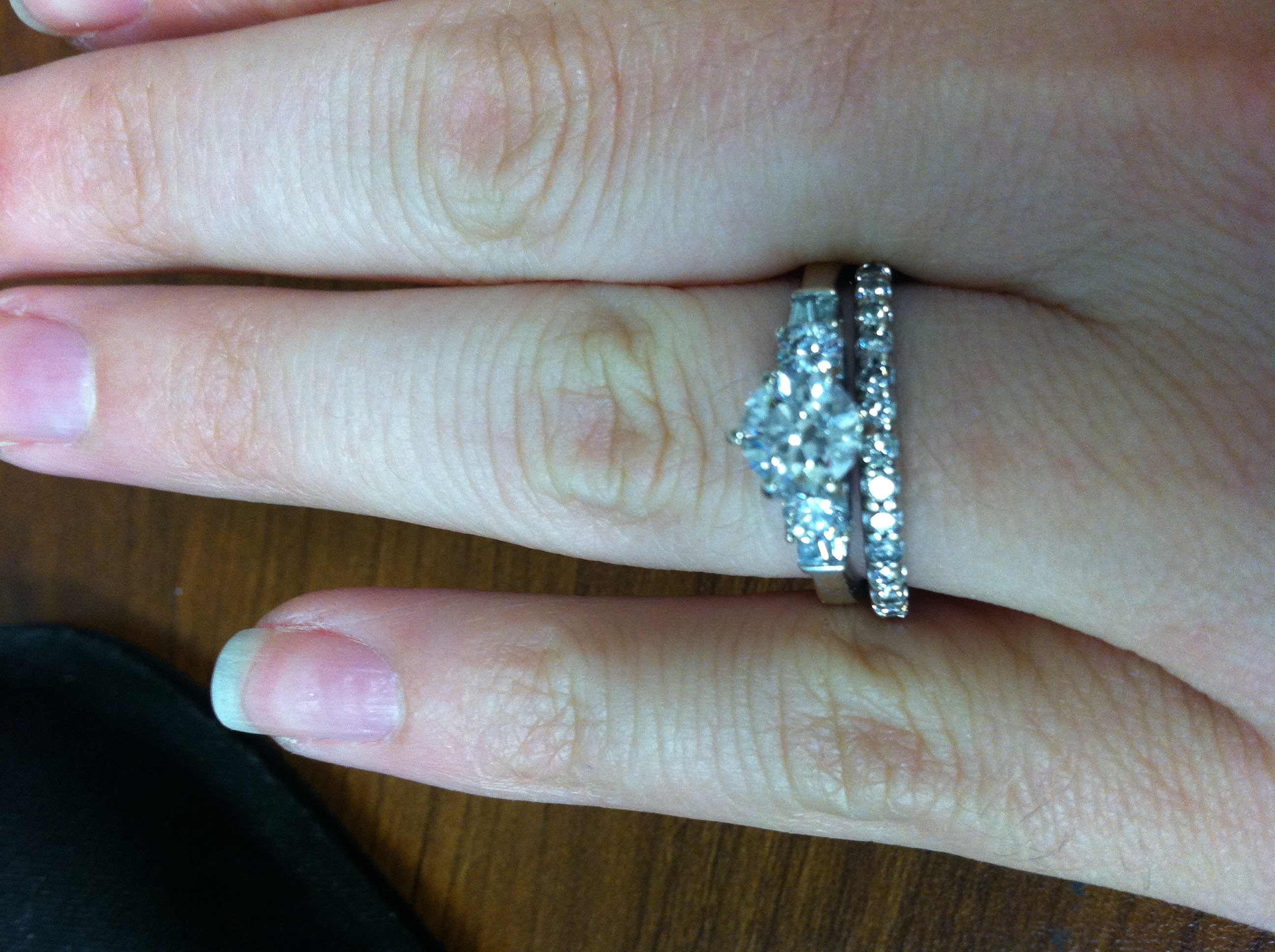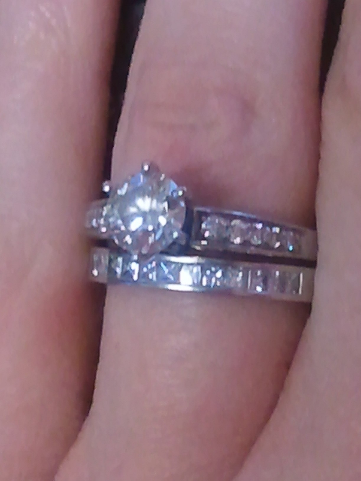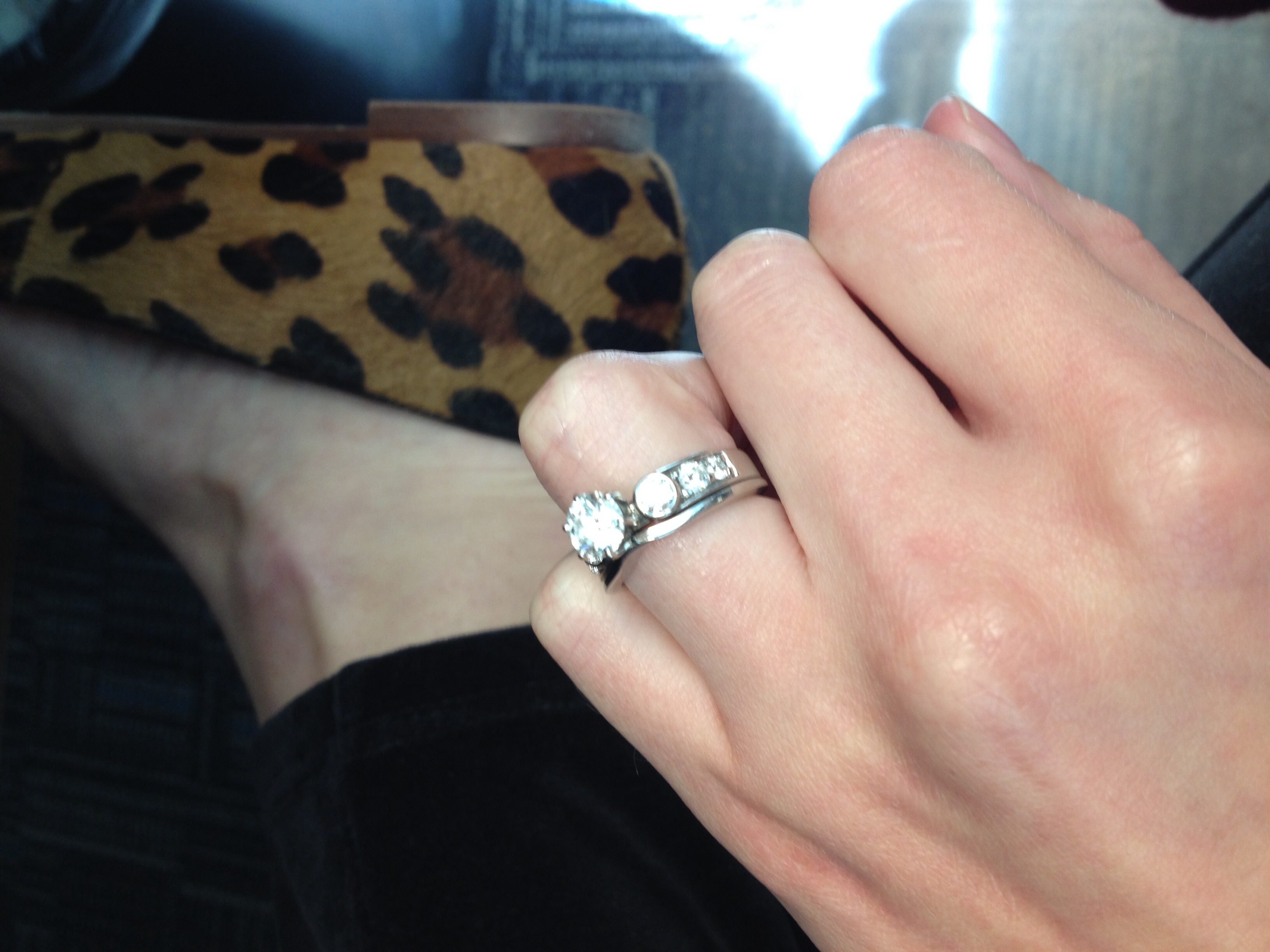 The engagement ring was actually just the center stone, and the wedding band wraps around it and has the other bling on it.