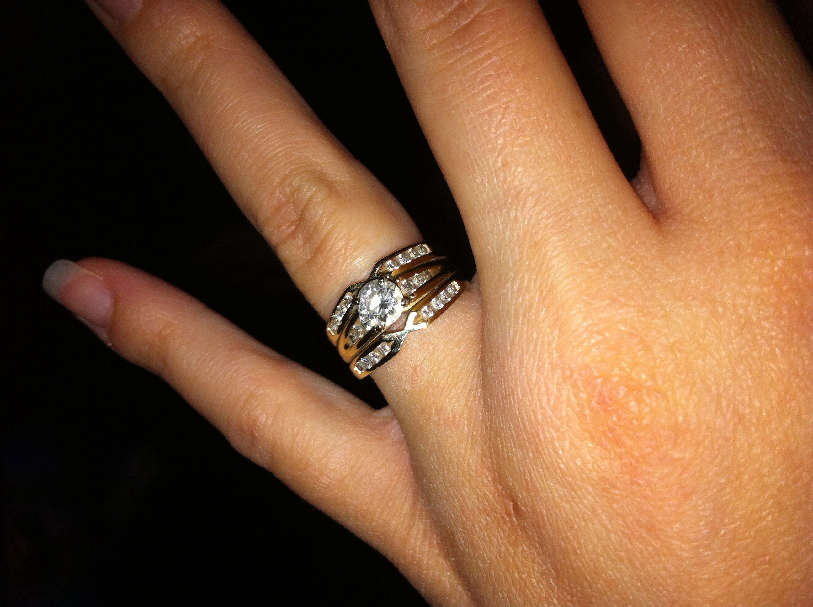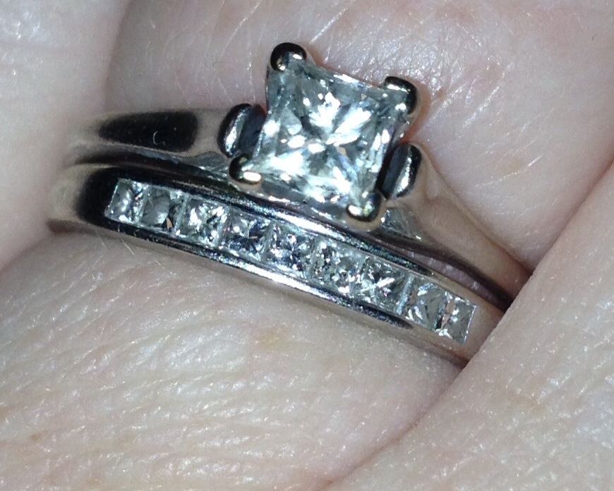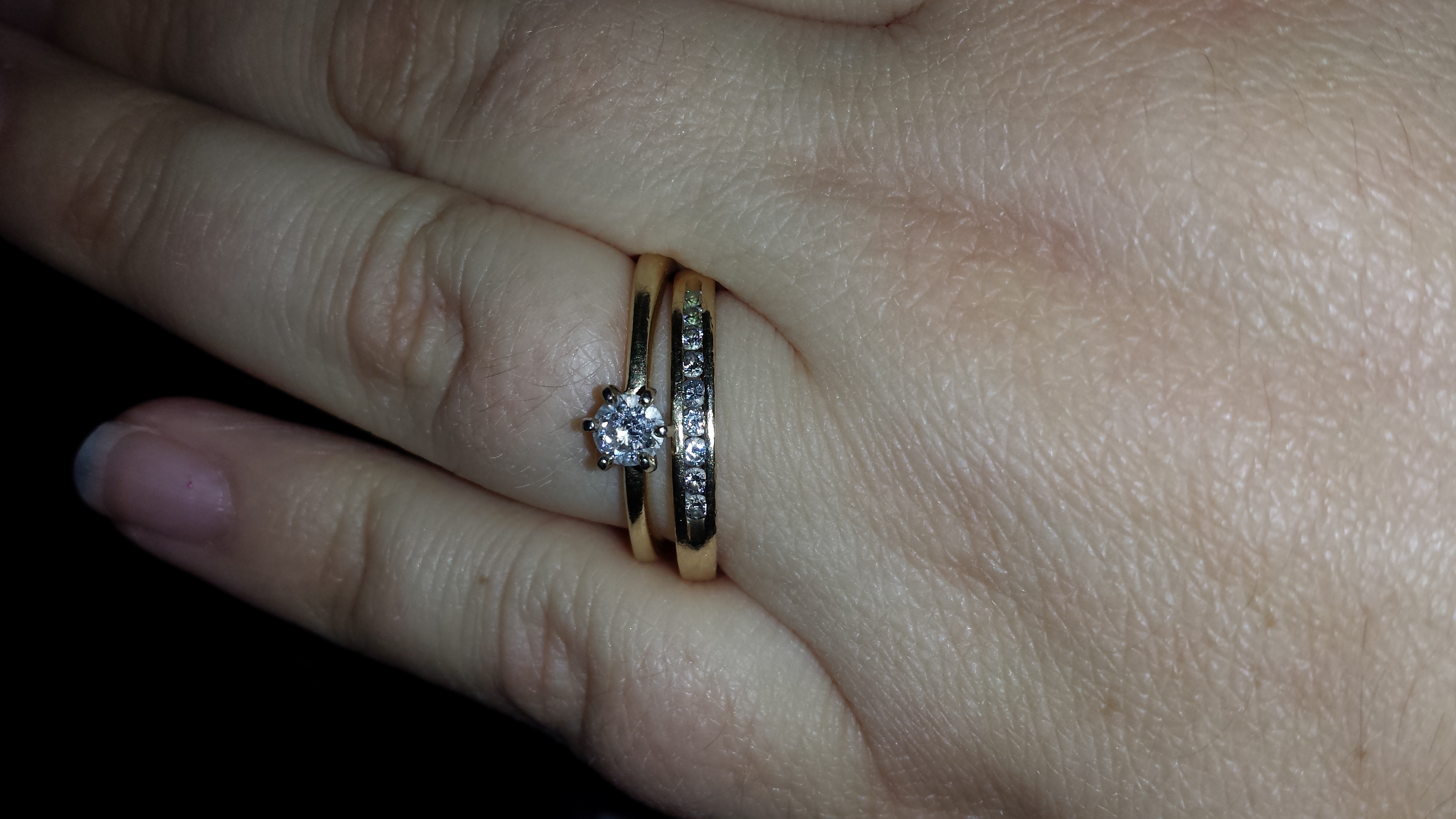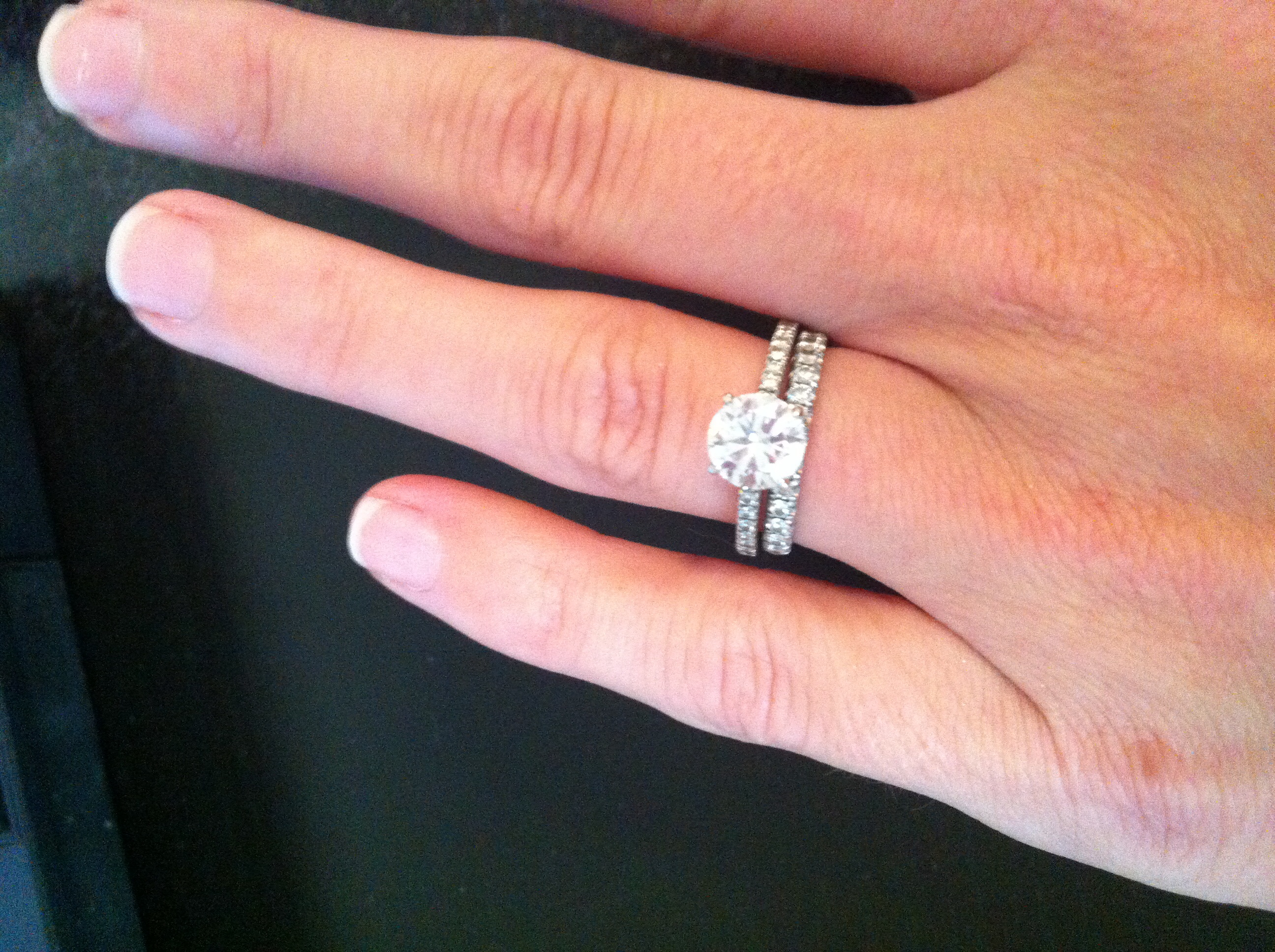 The engagement ring was actually just the center stone, and the wedding band wraps around it and has the other bling on it.