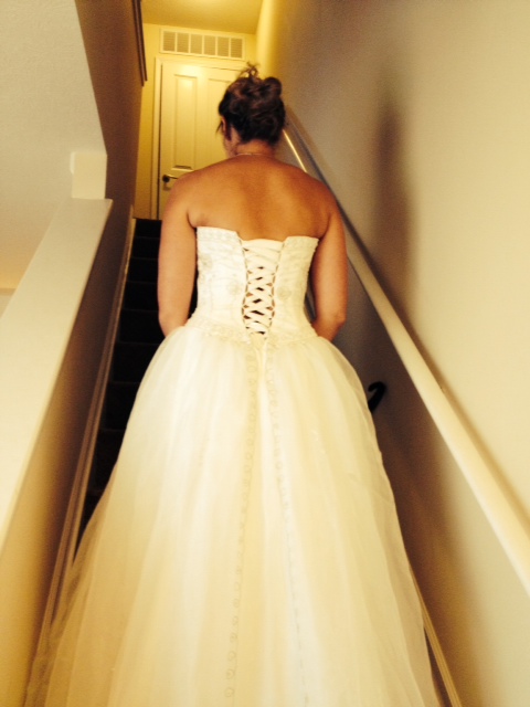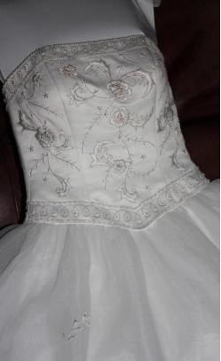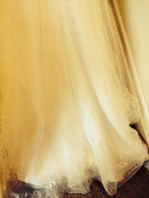 I have a wedding dress looking to sell! This dress has been persevered by David's Bridal. I am almost 5'10 and of average weight. This dress is originally $1,200. There are two small tears in the train that can be easily fix. You can't even see the tears because of all the tool on the dress. I can send additional pictures if you need them. You can also Google the style number an it will bring up additional pictures. The picture shown with the back of the dress their is a an ivory panel that you can stick behind the corset.