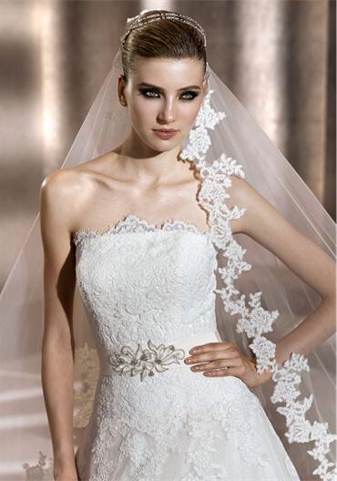 I opted for another gown which suited my tall frame better. However this dress will suit most body shapes. The Berlin is a strapless tulle gown with rebrode lace. It has a full pleated skirt which ends in a chapel length train.