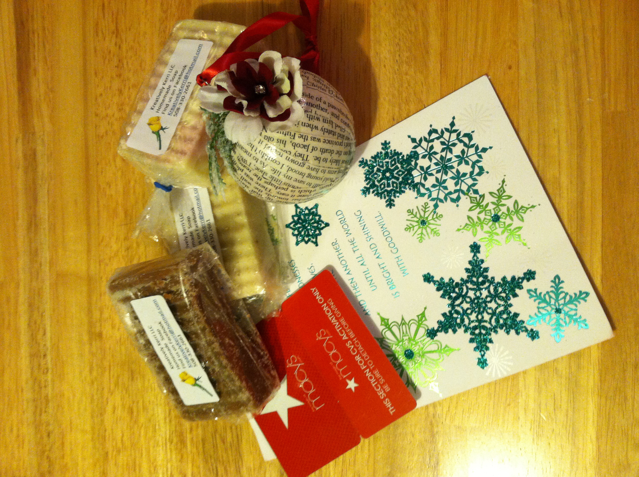 @amandaf6383, Thank you for the very sweet gift. The soaps smell amazing, the card is so sweet, the gift card will get used right away and the ornament is gorgeous! Did you make it? It's so elegant, simple and beautiful. I hung it right on the tree. Thank you so so much!