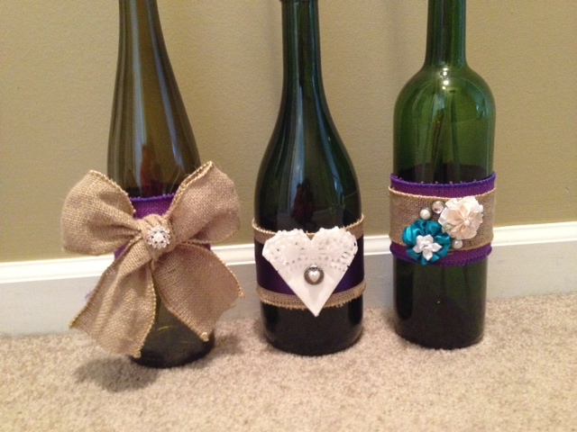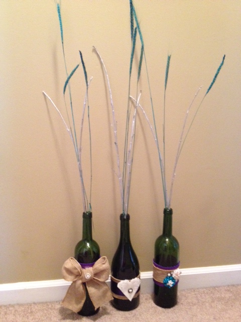 67 wine bottle centerpieces--22 of each style plus 1 extra. Decorative silver sticks and turquoise sprays included if wanted. I also have a lot of extra of the sticks and sprays if wanted. $70 OBO, price is negotiable. I also have some better pictures of them at the reception but the files were too big to upload. I can email them though.