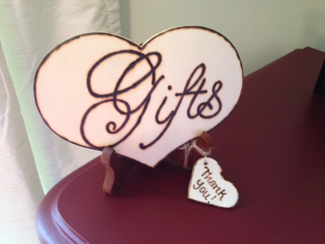 Wooden "gifts" sign with wooden stand (**I also have one exactly like it that says "Guest Book." It also has a wooden stand)