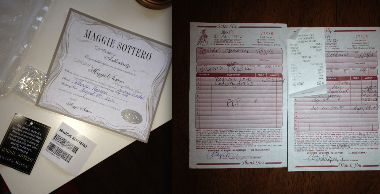 I have the original dress deposit receipt and full final payment receipt, which I paid over $1300 total for (not including accessories/veil). I also have my certificate from Jinny's Bridal that states this is an original Maggie Sottero piece (of course made out to my name).