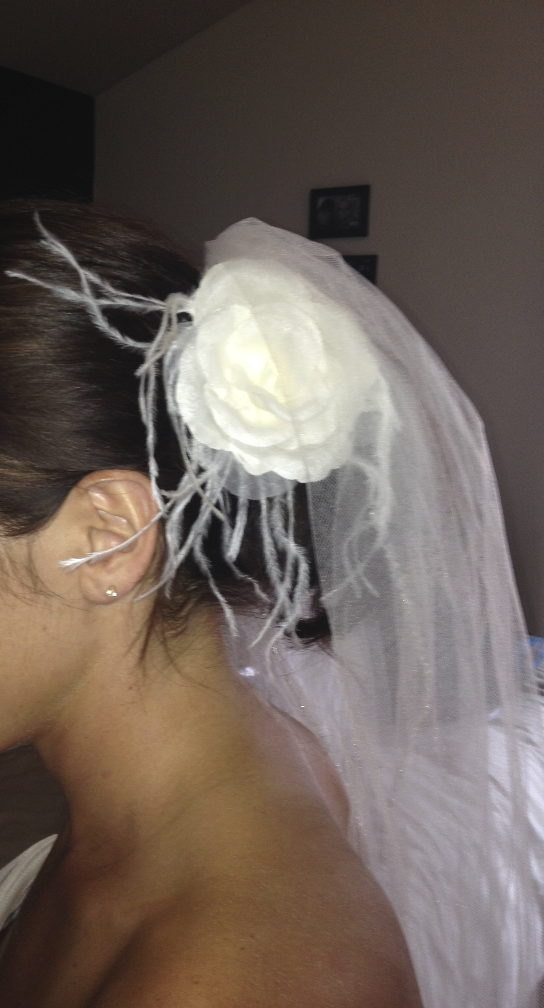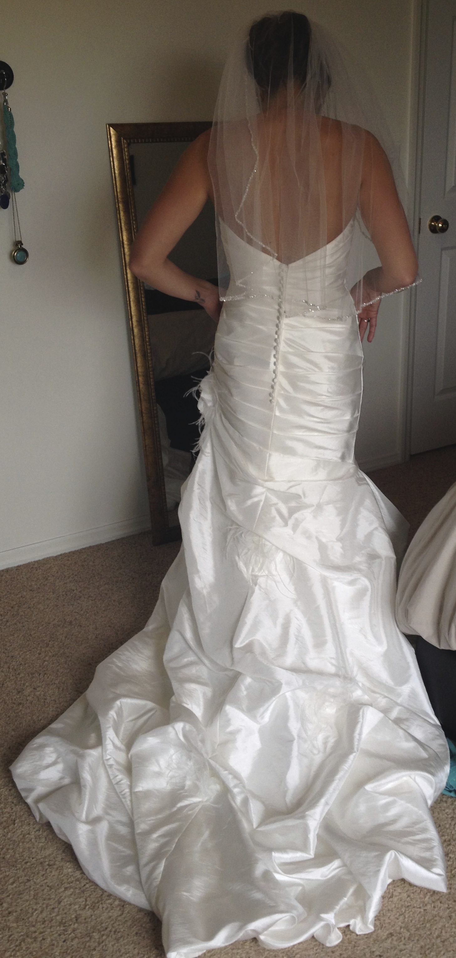 This beautiful 2Be wedding gown is brand new with original tags, proof of payment, and original garment bag. It has never been worn and is in perfect condition. I purchased this dress 2 years ago and then the wedding did not occur. The label size of the gown is 6; however, it does run somewhat small as I am typically am a size 4 pants and a size small top. To give you an idea I am 5'5", 128 pounds with a 34C bust. The dress has NOT been altered but it is a little big on me and would have needed some altering. The dress is absolutely beautiful and the fit is very flattering. On each pick up their is a flower (as shown below in hair) with delicate feathers as an accent. The extra flower is included in this purchase and can be used as a hair accessory. The dress color is ivory but looks more like a soft white.