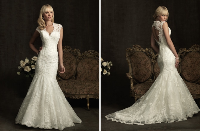 Allure Bridal Gown Style 8923 This slim, fitted gown in all-over lace features a beautiful neckline with contoured straps that continue to a keyhole back. A chapel length train and covered buttons complete this elegant style. This dress has never been worn to an event. No alterations have been done to this dress. Selling for $950. Never Worn. Found a different dress instead.