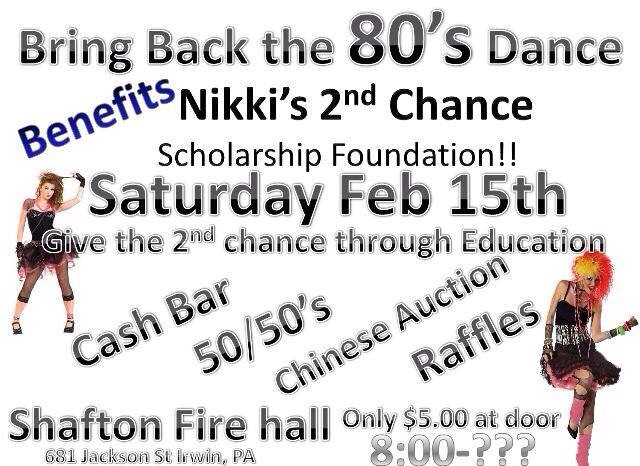 Hey ladies! If you and your hubby haven't decided on a fun date night for the weekend look no further! My girlfriend is having an 80's dance to benefit the scholarship fund she set up after her sister died from an overdose on drugs... It will be this Saturday night at Shafton Firehall in North Huntingdon! It's only $5/person and you don't have to dress up unless you want to! Here is a copy of the flier! Hope to see some nesties there to help a great cause!