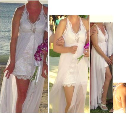 $250 for custom beach wedding dress: 5'4" bride actual dress size 6-8, can be made smaller. Absolutely stunning & sexy! email: jodimaslowski@gmail.com