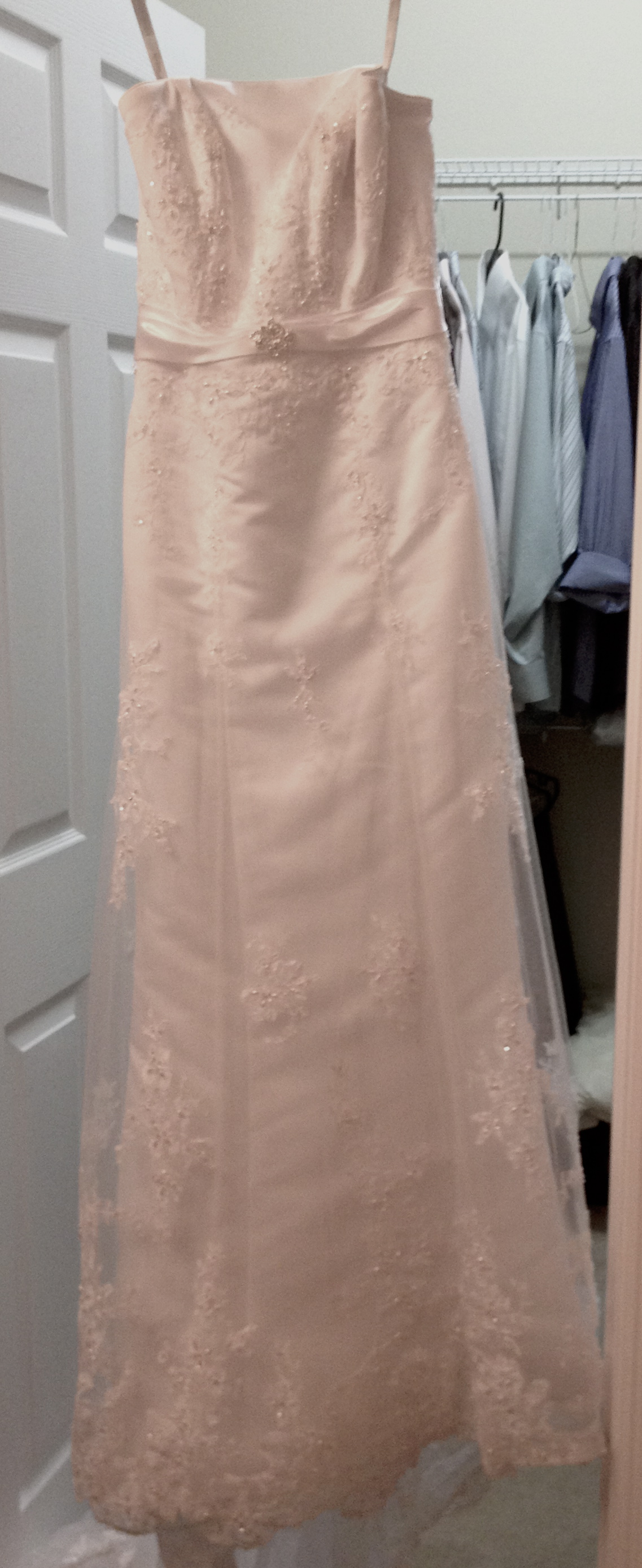 2011 Alfred Angelo dress: white, extra long train (perfect to bustle), strapless, A-line, netted. The dress is 100% polyester with 100% nylon netting (beaded).