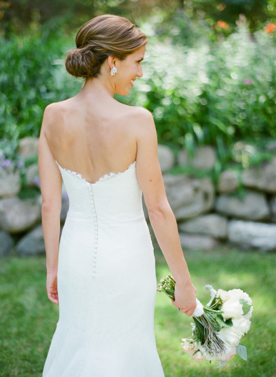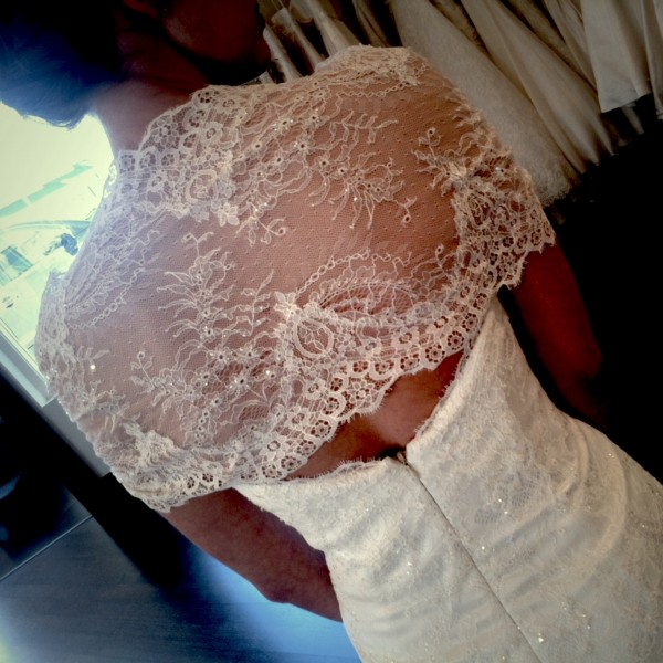 This AUGUSTA JONES dress called JAYMA is gloriously chic. This streamlined, form fitting fine lace wedding gown glides with every step. The sweetheart neckline, hem and train are trimmed with a scallop lace. Available with a detachable lace wrap. If you want to go conservative, wear it with the wrap, if not it comes off easily.