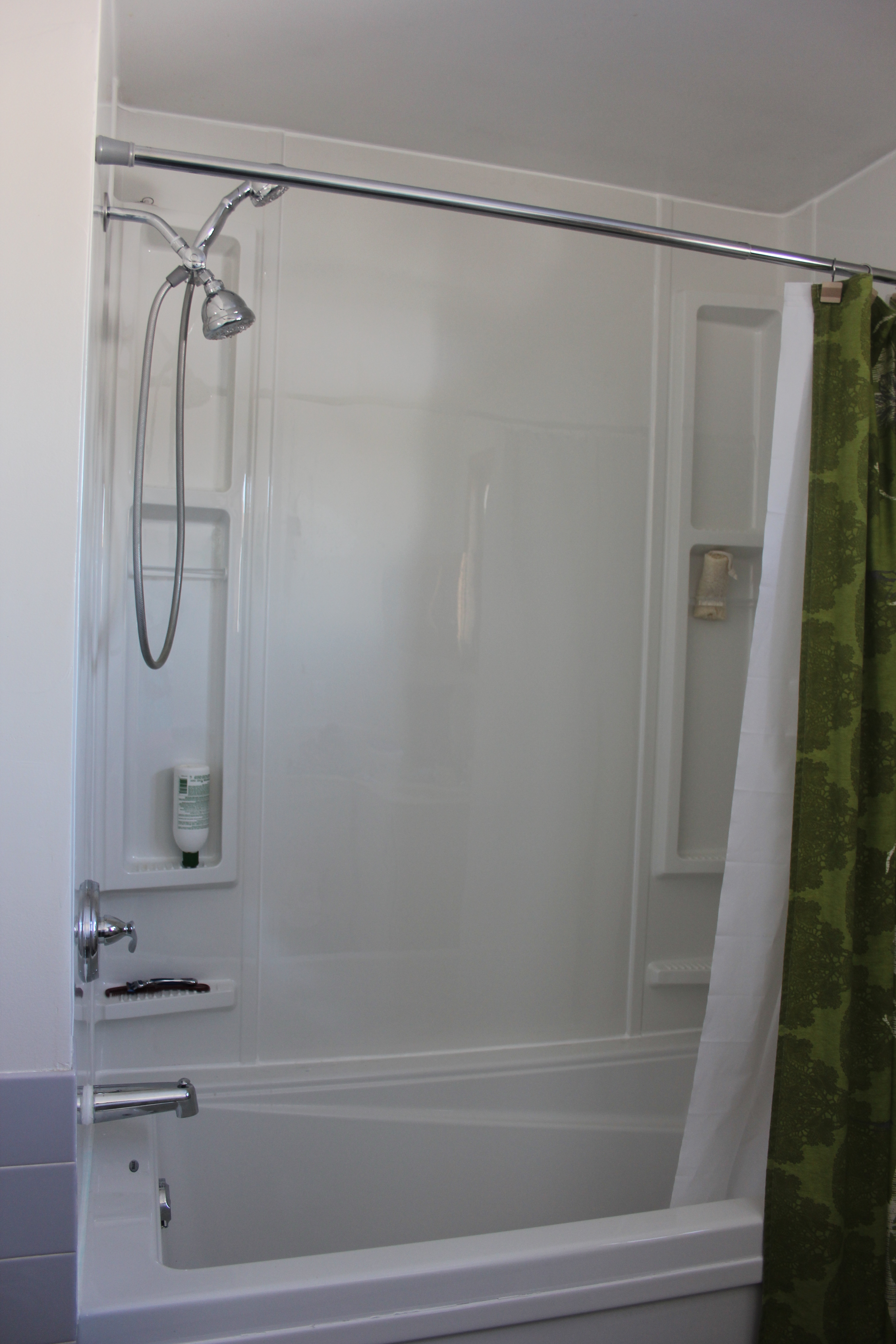 In the main bathroom, we rerouted the plumbing to the shower so that the new tub could face West instead of East (which was an outside wall), a new surround and tub were put in, the light fixture was replaced and the wall tile was painted.