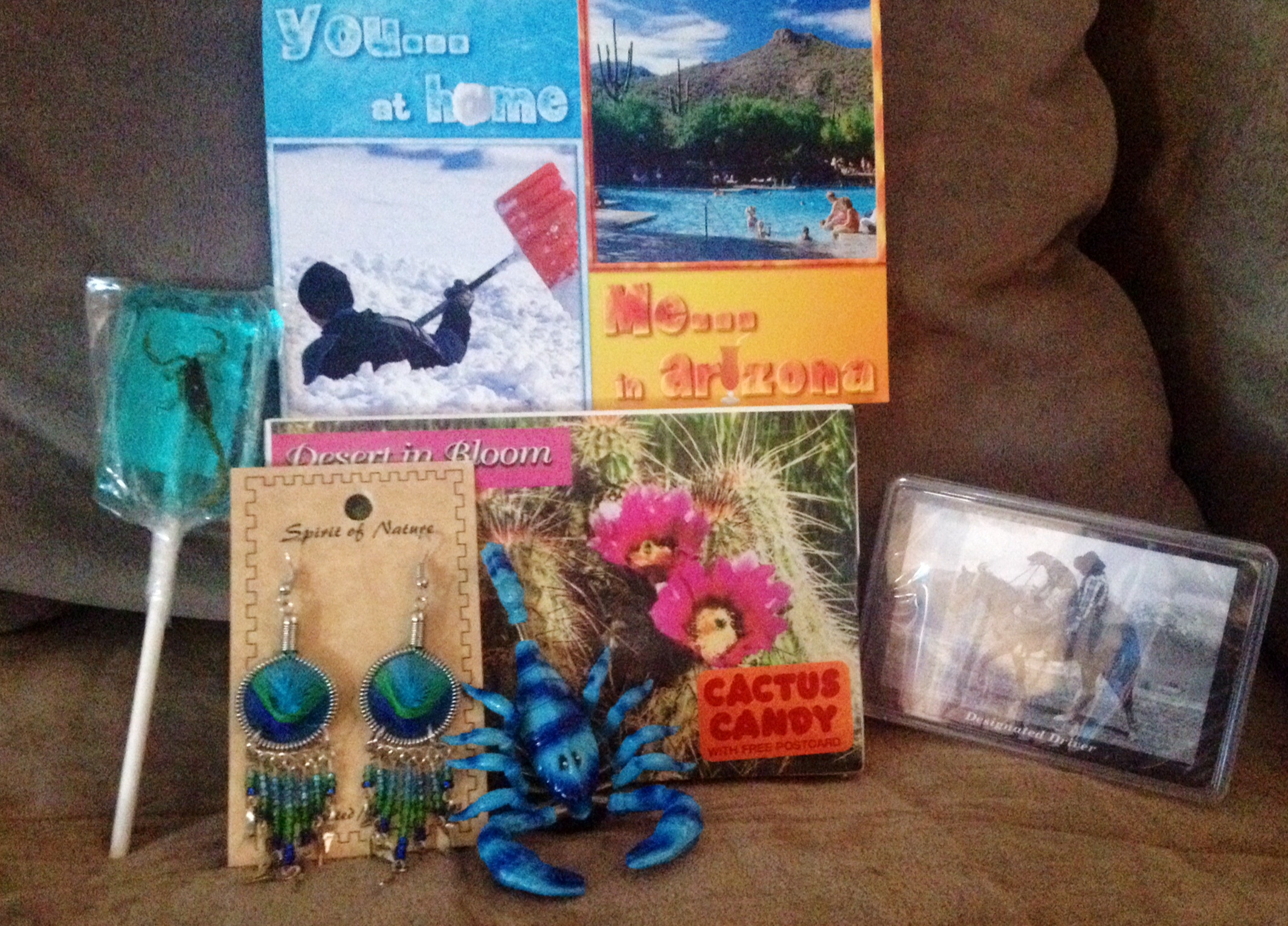 I love all my AZ goodies! The post card was hilarious! haven't had cactus candy in the longest time. The earrings are gorgeous (and will look great with the dress you sent last month)! I laughed at the cards and literally threw the magnet at DH as soon as I opened it. My step son was both intrigued and grossed out by the lollipop. I told him he could have it but I think he's too scared.