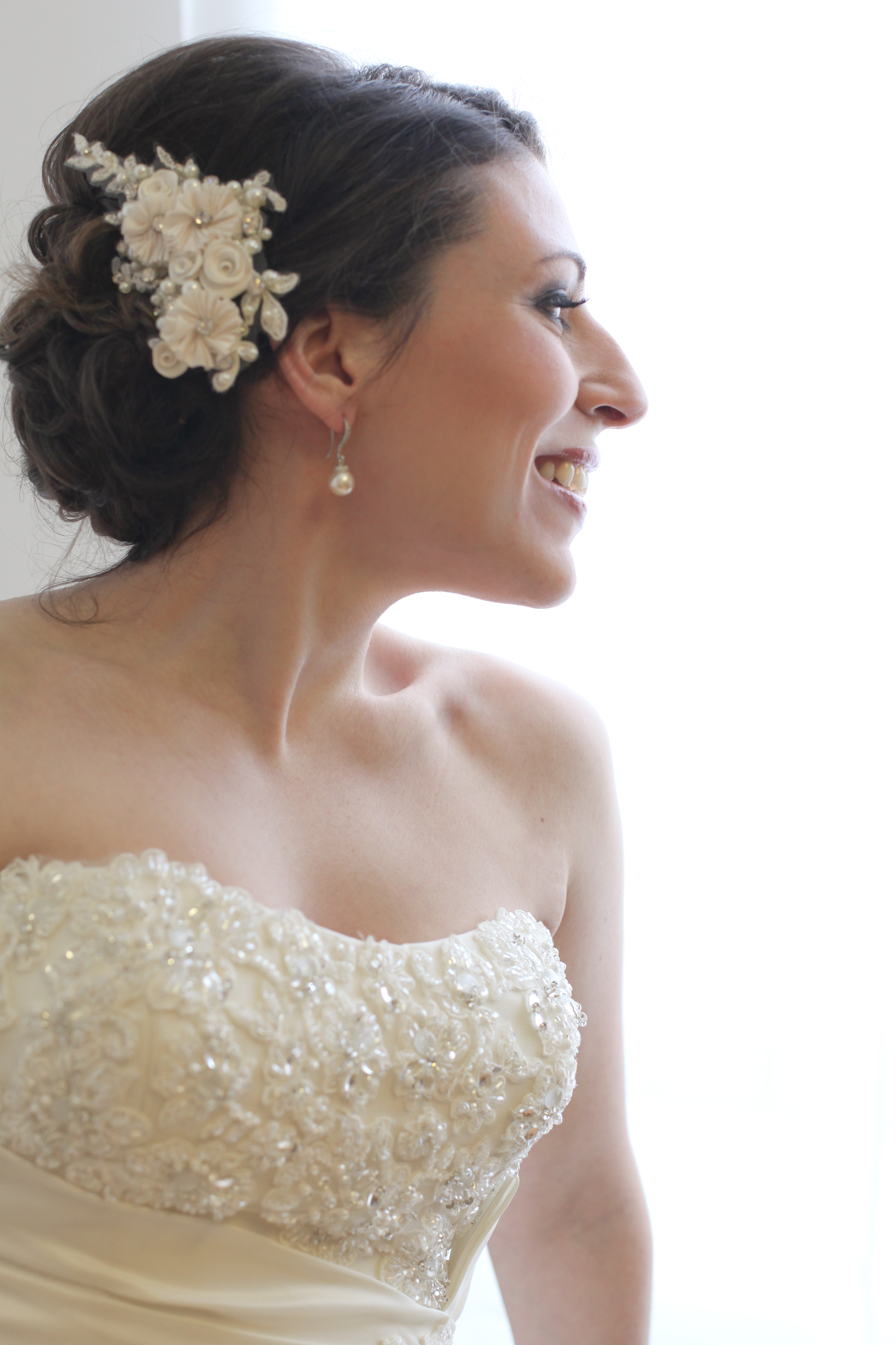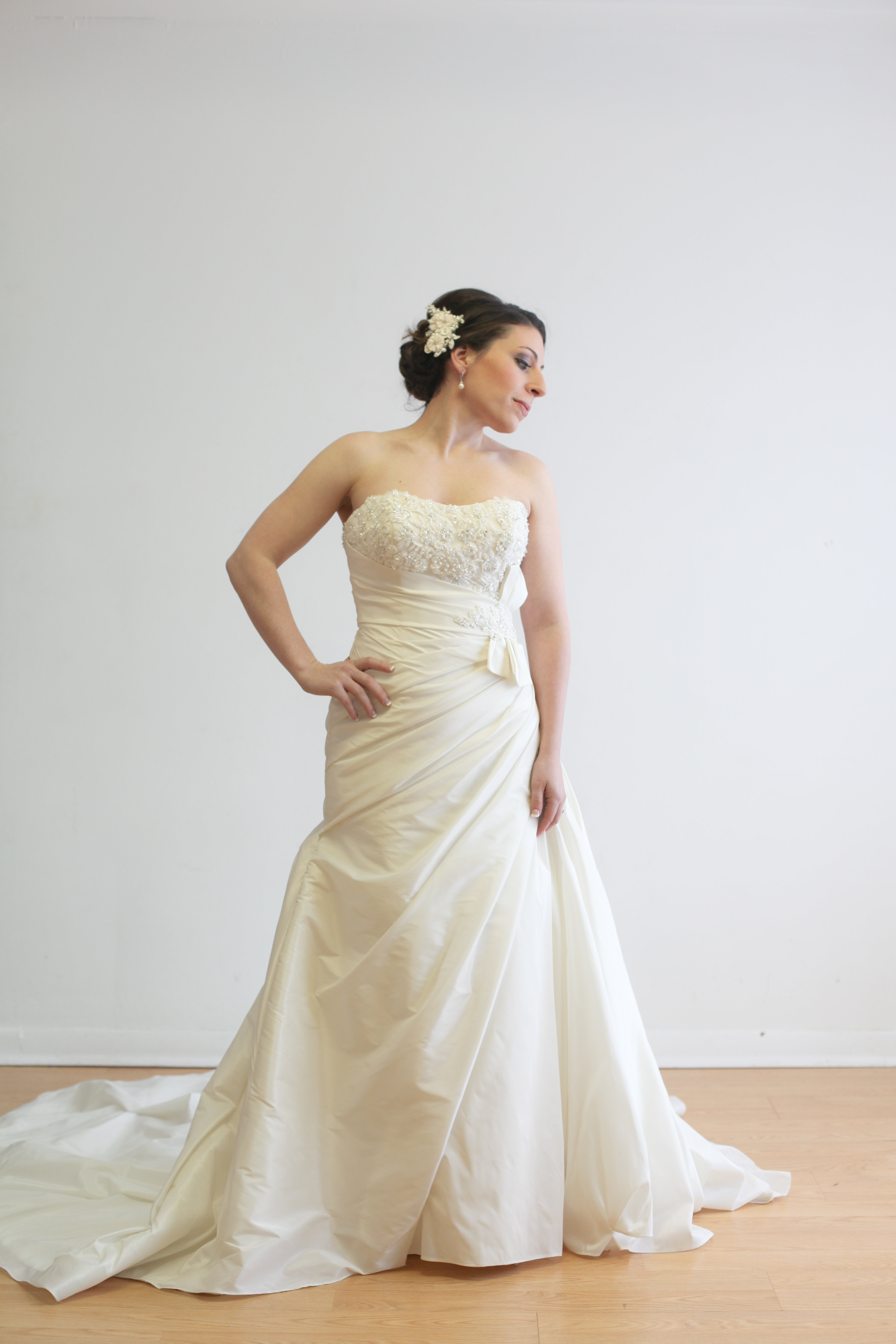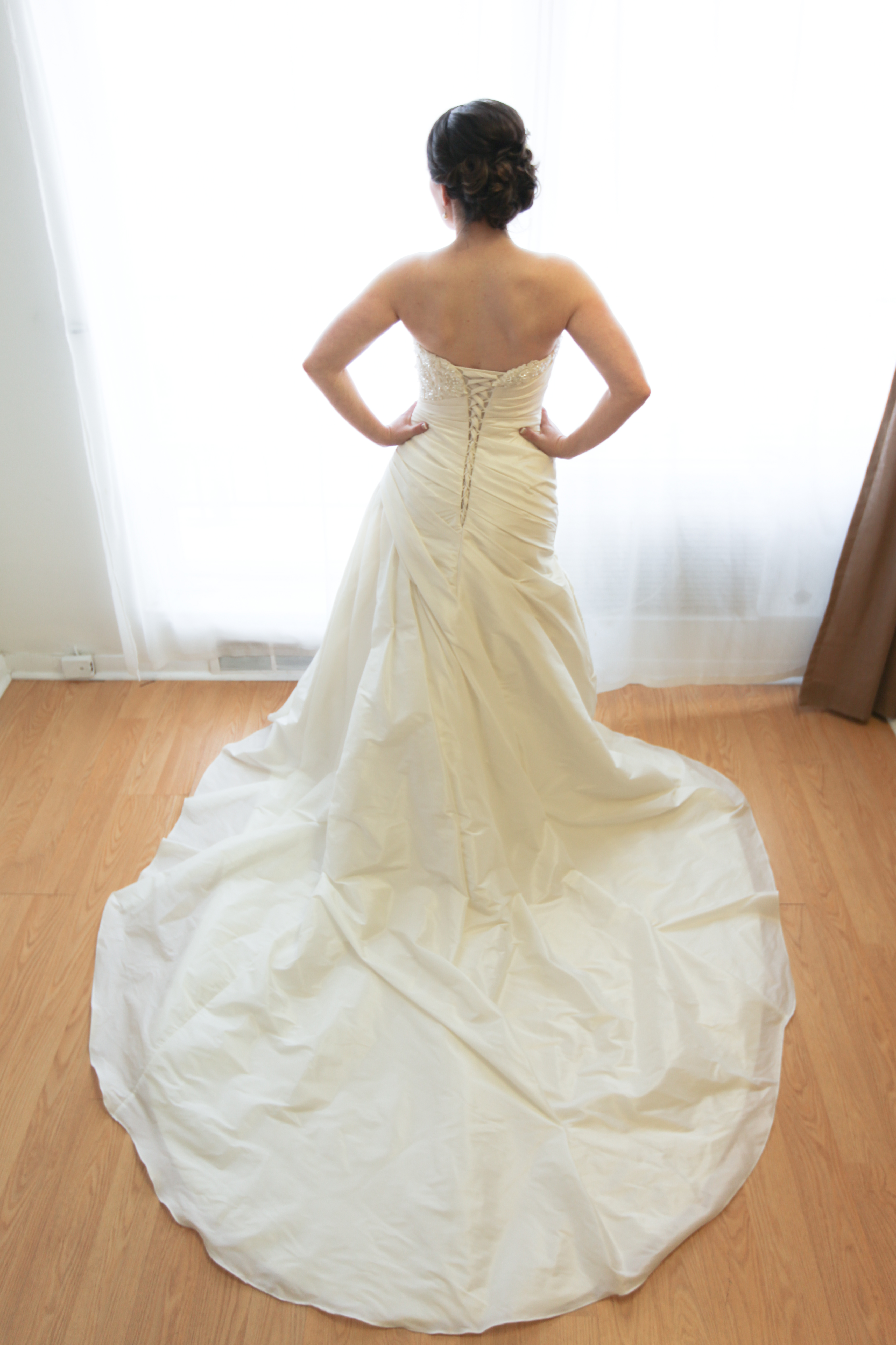My wedding was April 12th, 2014 and I was so lucky to have found a Soterro and Midgley creation for my big day. The dress is a mermaid style, ivory floor length gown with medium train and a French style bustle. The dress is strapless with beautiful pearling and bead work on the top bust and a corseted back if it was necessary to move up a size or two, this could be easily accomplished.