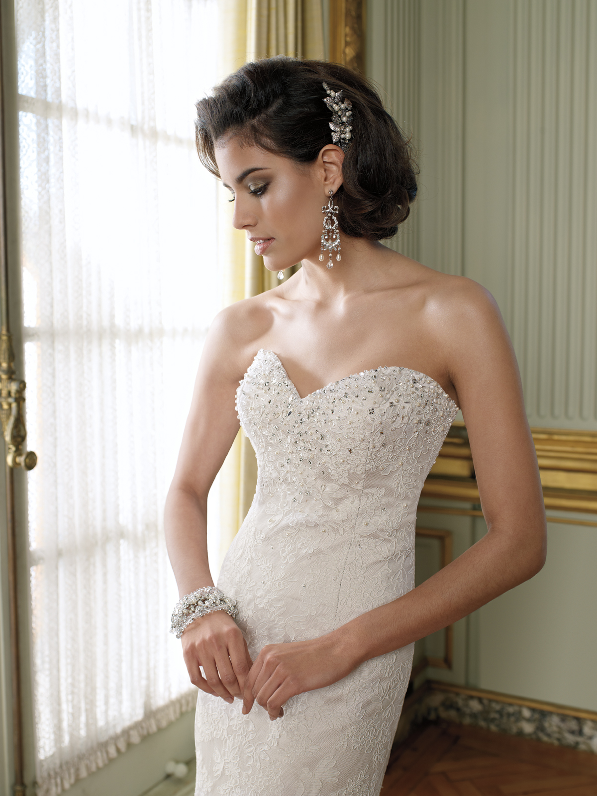 It's an Ivory, strapless dress with a sweetheart neckline, sequins and beads on the torso. The model number for this dress is: 212242, size 10. Designer Photos attached.