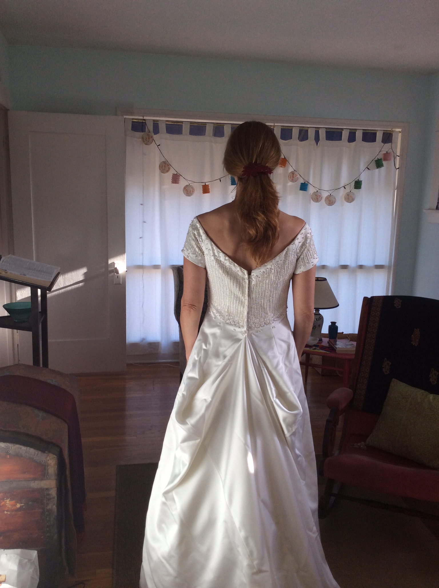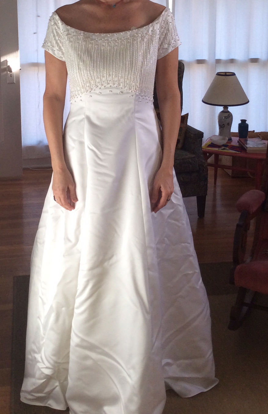 This stunning classic wedding gown is waiting for you! It has been worn one time. It is a size 8-10 (was a 10 but was altered to make smaller). It has pearl beading on the bodice, back and cap sleeves. It is white satin. This gown was dry cleaned and has been in its sealed box, so is in need of a steam for minor wrinkles. It is in supreme condition.