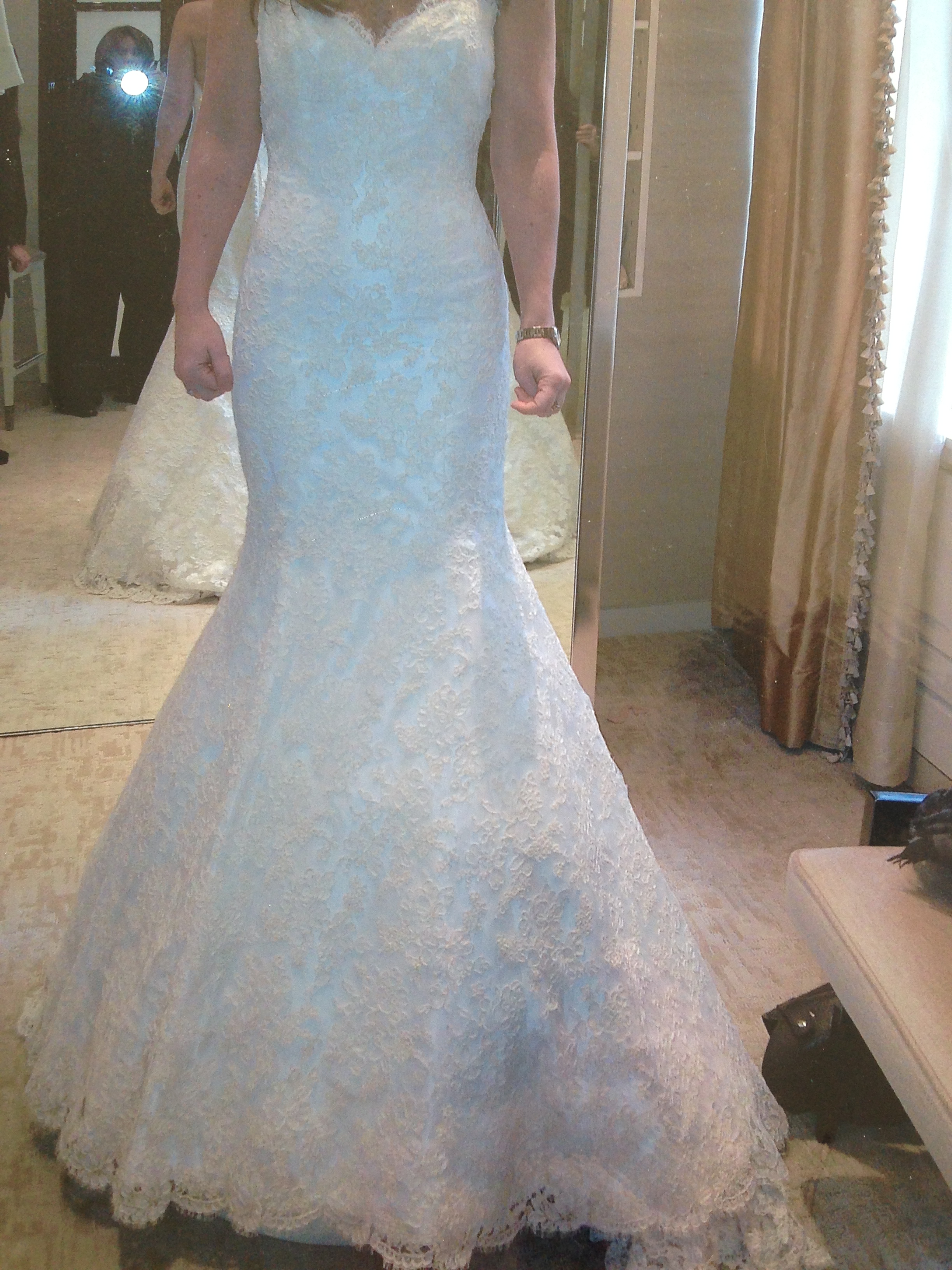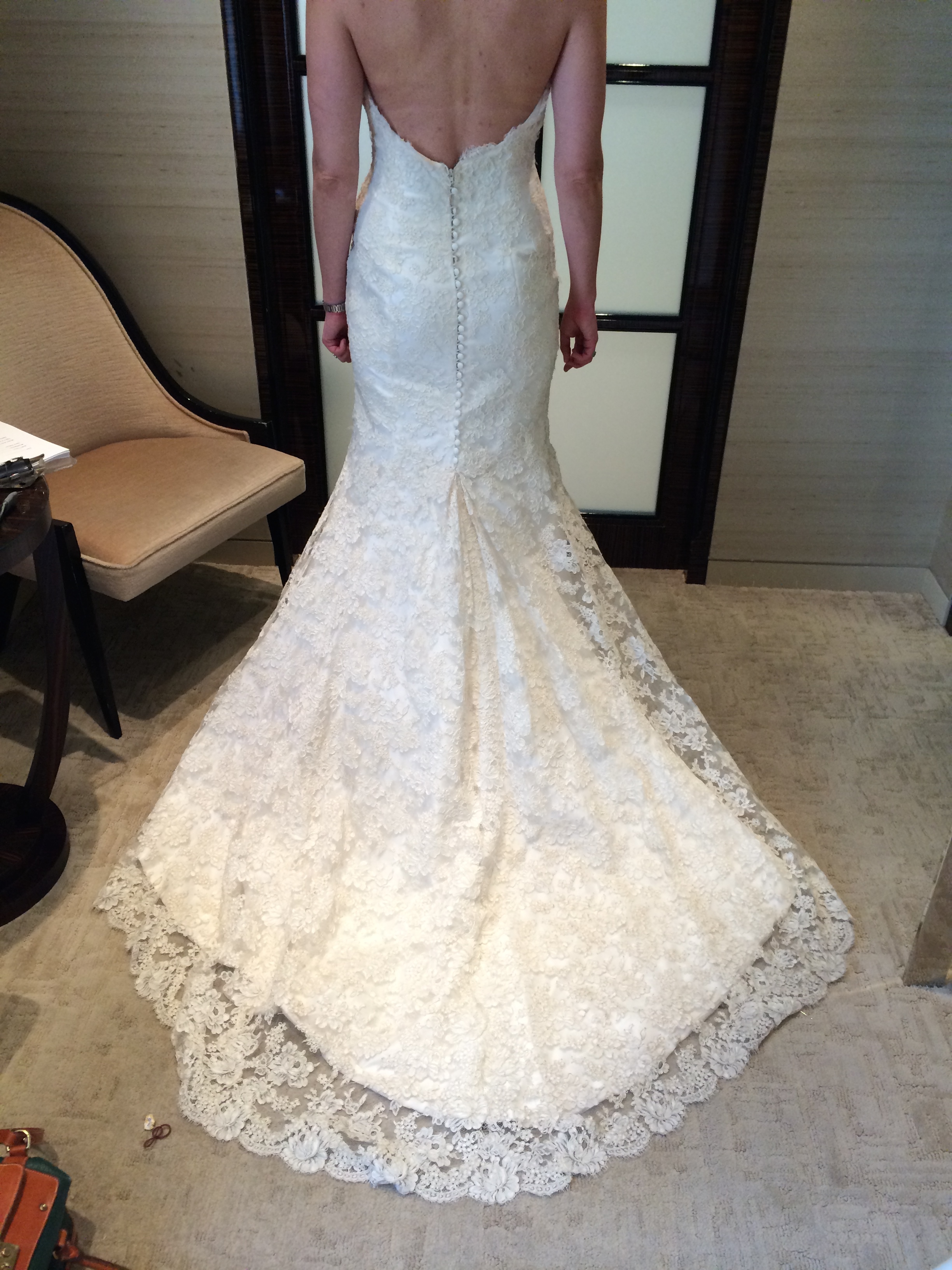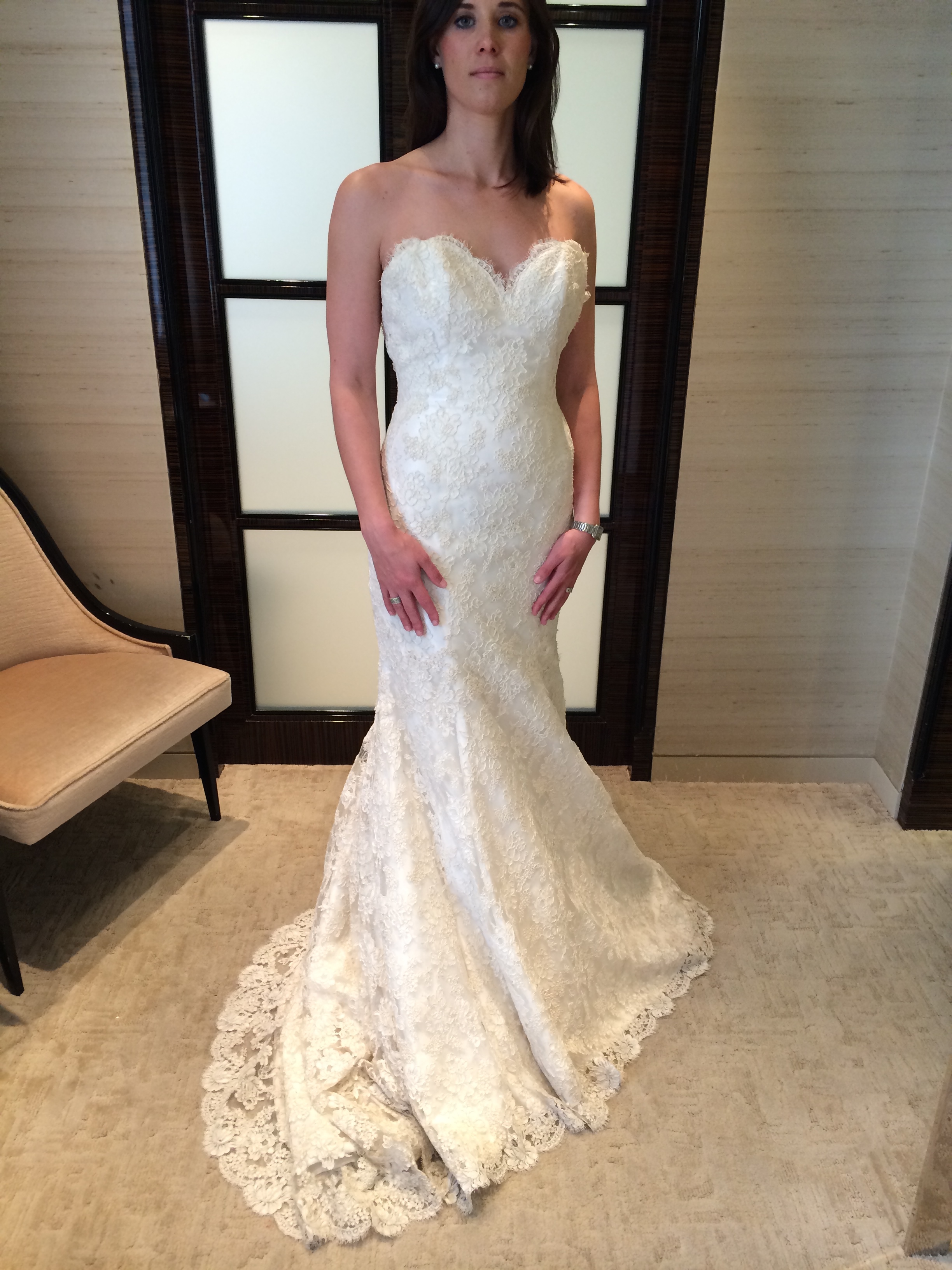 A friend of mine cancelled her wedding so I'm helping her sell her brand-new, never-worn, still in original packaging Ines Di Santo dress. It's a mermaid-shaped, sweetheart neckline strapless ivory lace dress. Measurements are below; pictures are of me wearing the sample at Bergdorf Goodman.