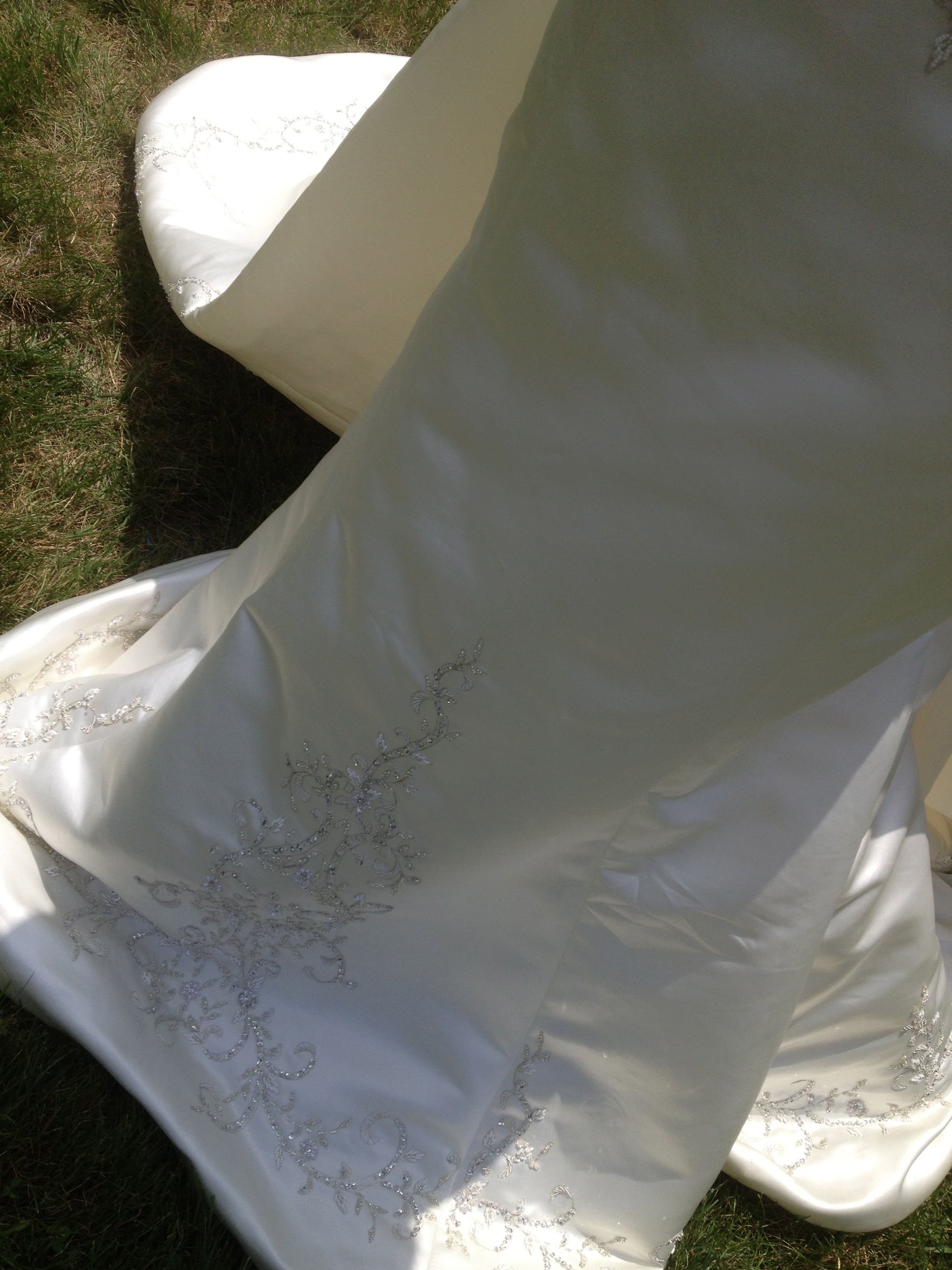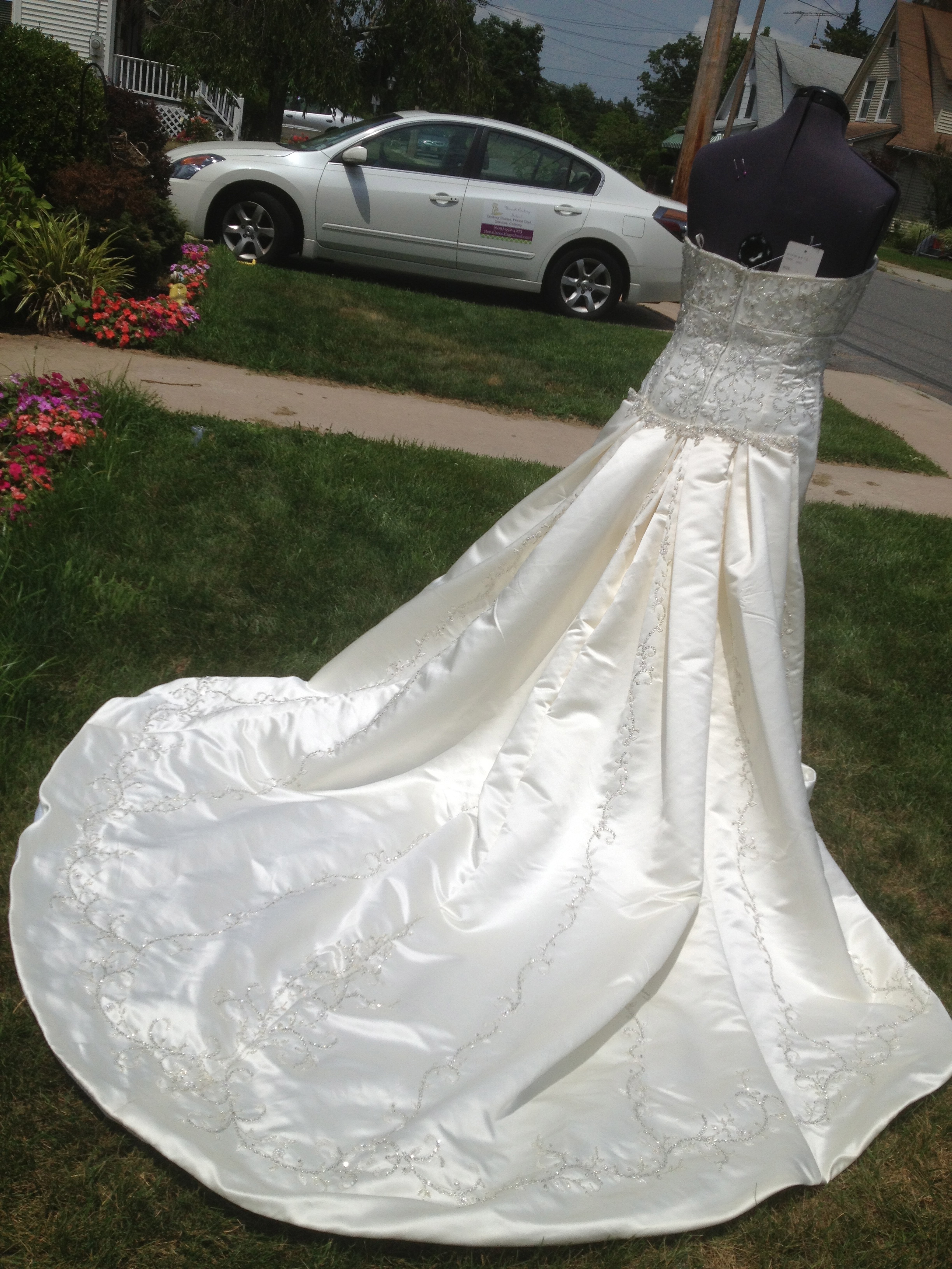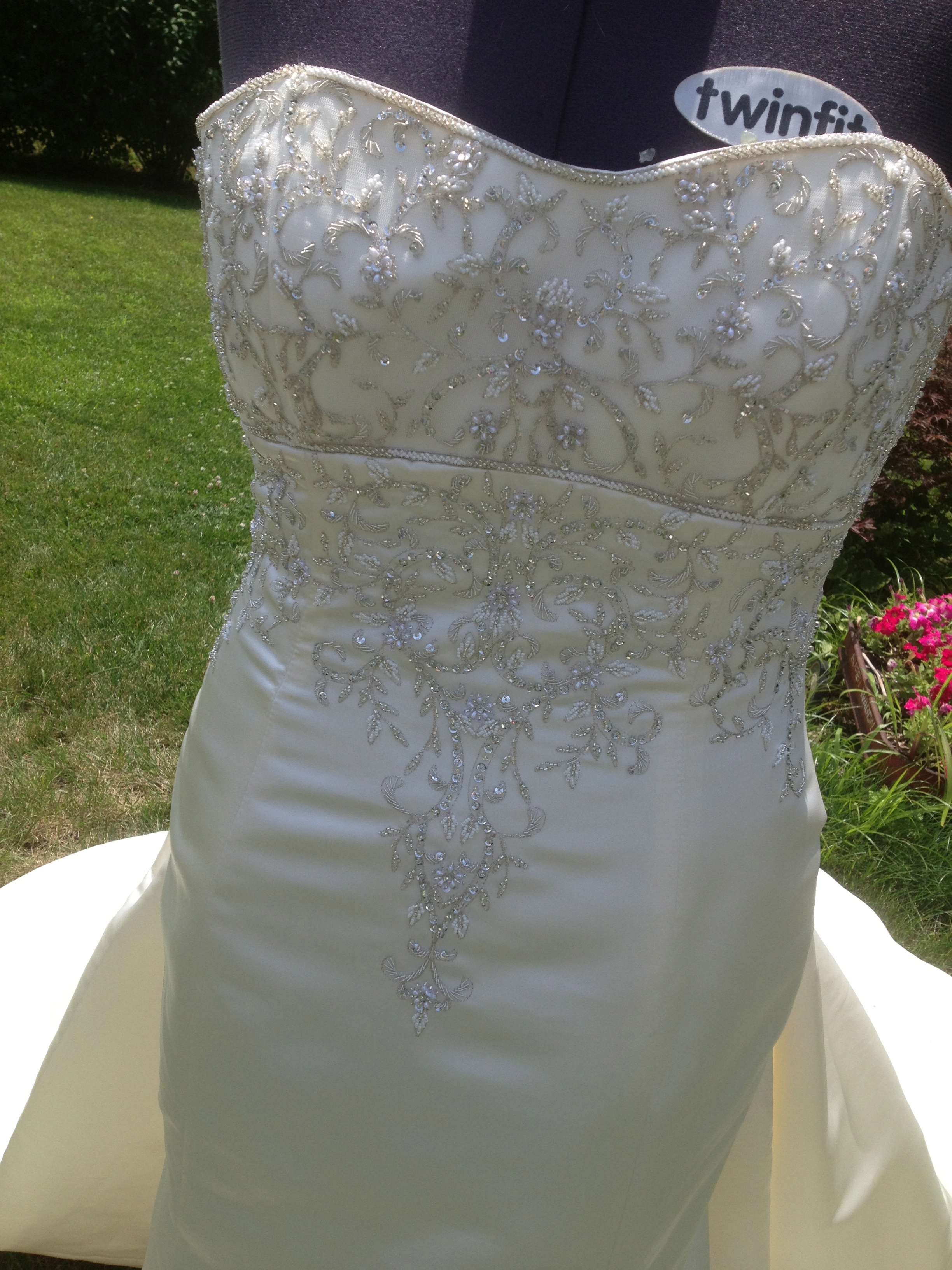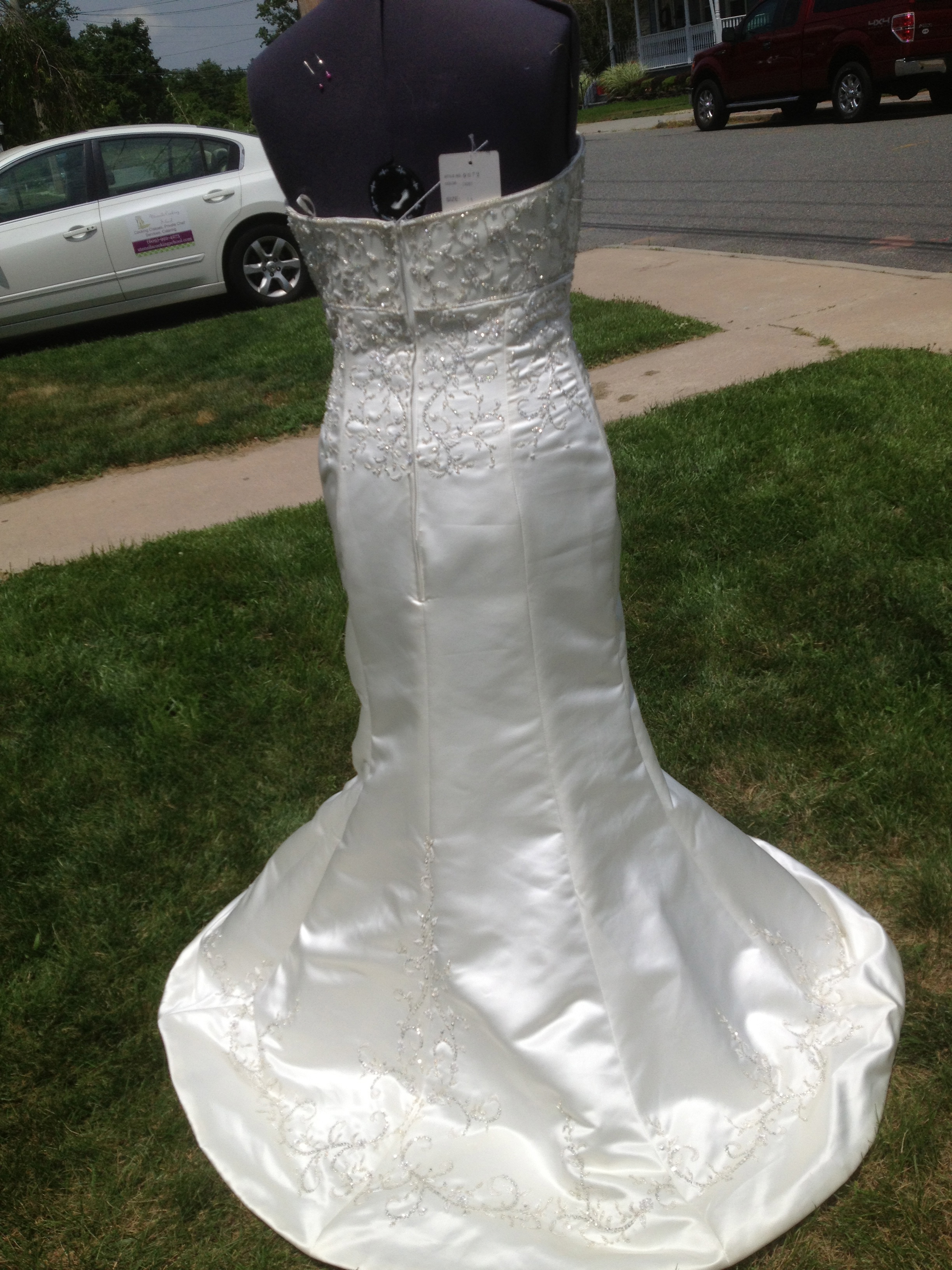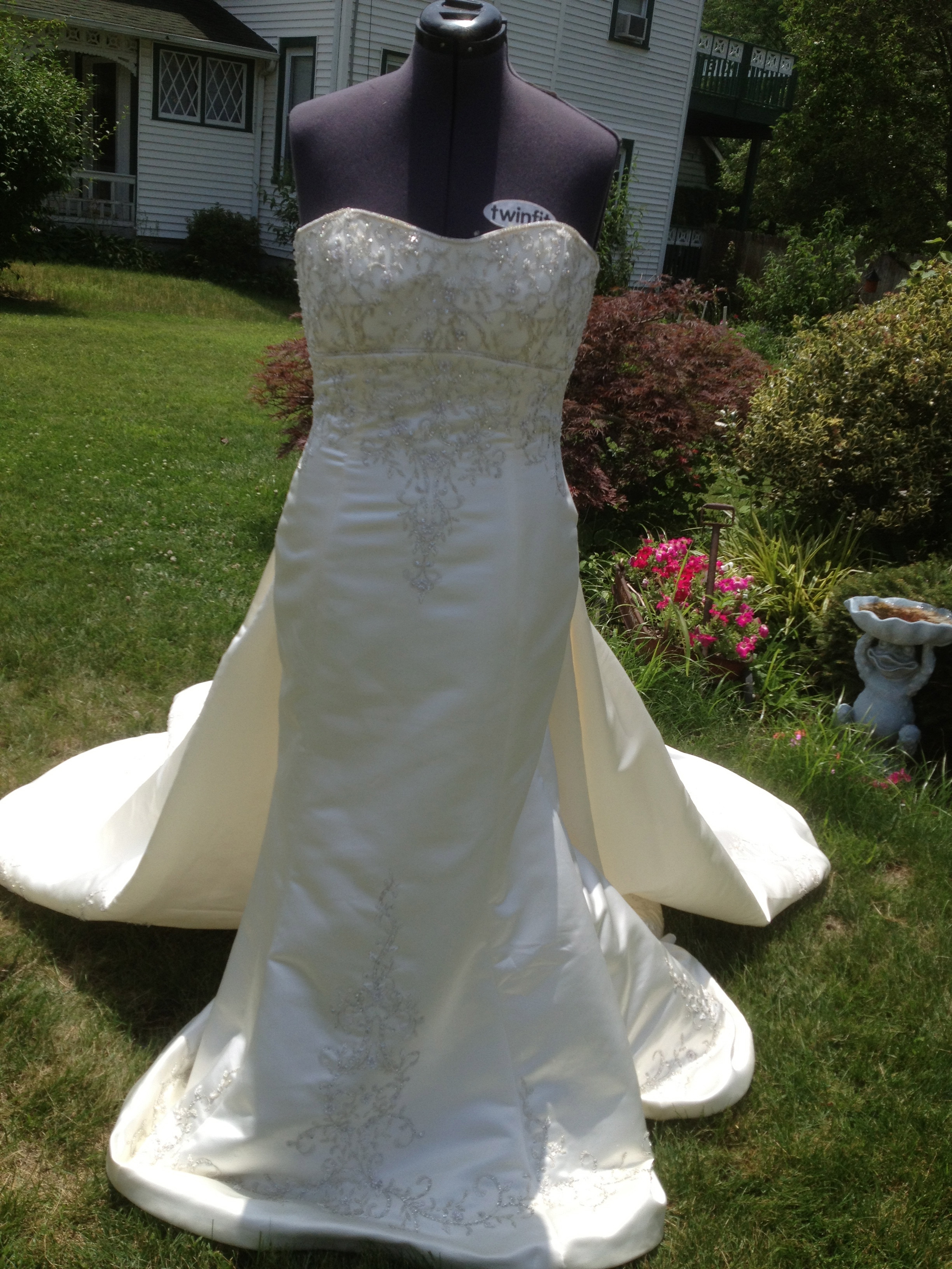 Beautiful mermaid style ivory wedding gown has a sweetheart neckline and beautifully beaded bodice and hem along with a very dramatic detachable cathedral train. New with tags bridal size 12/clothing 10 on a size 12 dress form for reference.