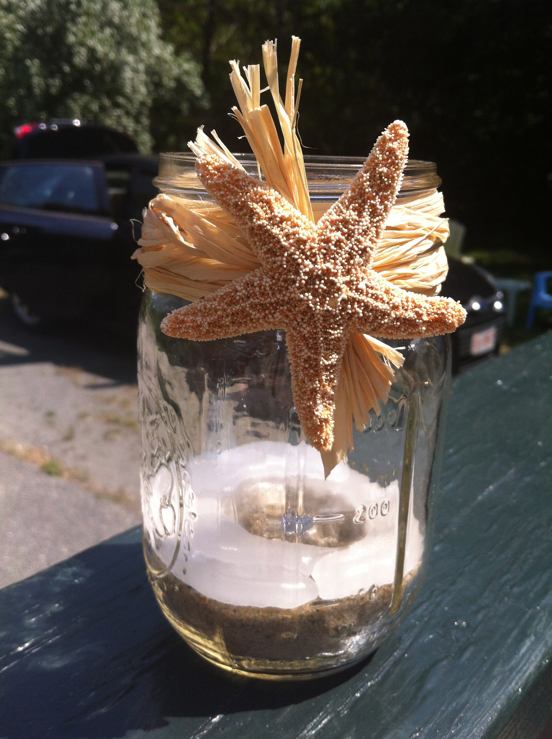 6" mason jars, wrapped with raffia at the top, affixed with a small, tan starfish
