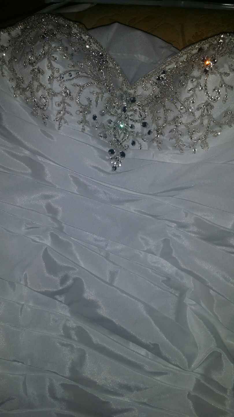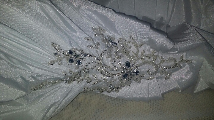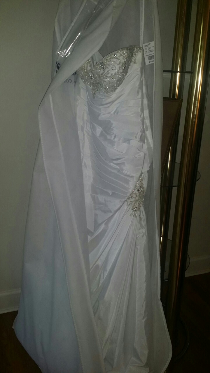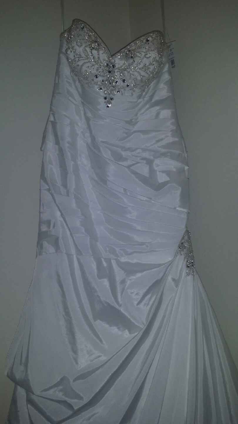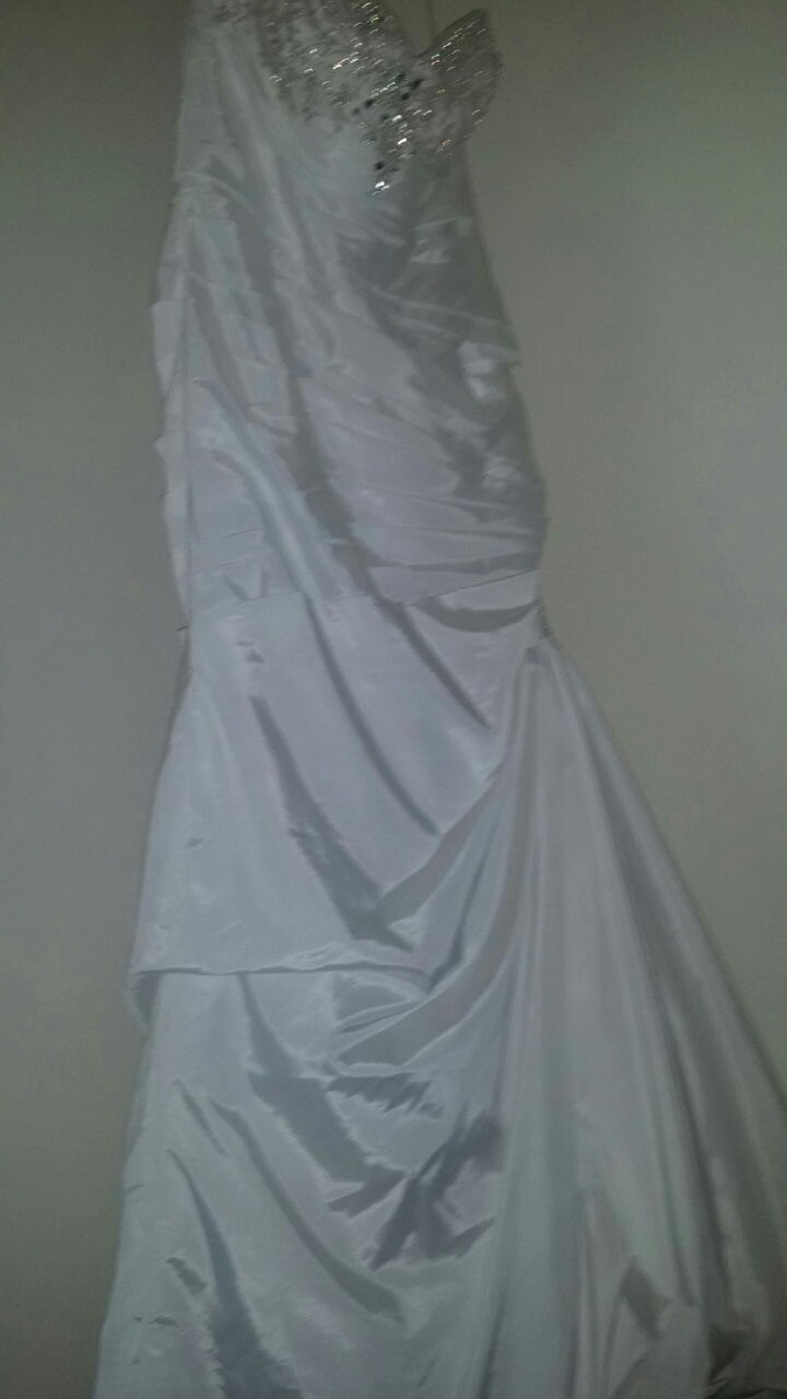 The Dress is simply beautiful and different. It has crystals along the sweetheart cut, and crystals on the right side of the dress near the thigh. . It fits in all the right places, it's classy and breath taking. You can look at the dress on David's Bridal website,(Strapless Sweetheart Trumpet Wedding Gown Style V3476) I wear a size 12 in regular dresses and purchased this dress in a size 14. I'm a curvy gal, and the dress fits PERFECT! I found out I was pregnant after I purchased the dress, with a due date of December 29, 2014 and my wedding date was December 27, 2014. I refuse to get married with my huge belly. I'm happy about my new bundle of joy that's on the way, but gotta get rid of this gown. I'm gaining weight like crazy and will have to burn a few pounds before I even think about having a wedding. You would love this dress, I fell in love with it the first time I tried the sample on in the store. This dress has never been worn, nor has it been altered. Never worn, tags still attached! I also purchased a cathedral two tier veil that has crystals on as well. I paid $150.00 for it, I'm selling it for $75.00. Buy the dress and tell me why I should give you the veil for free and I just may!