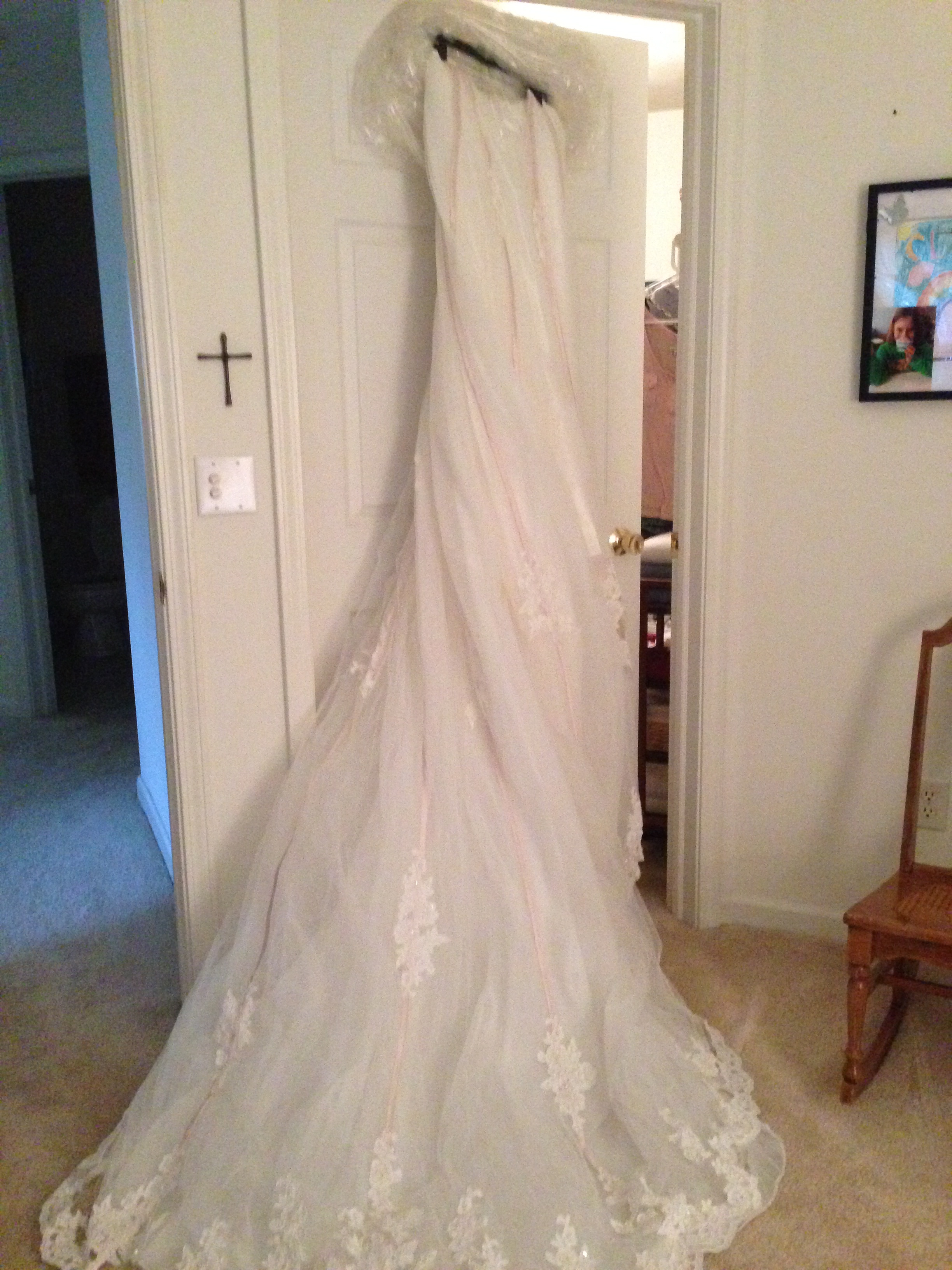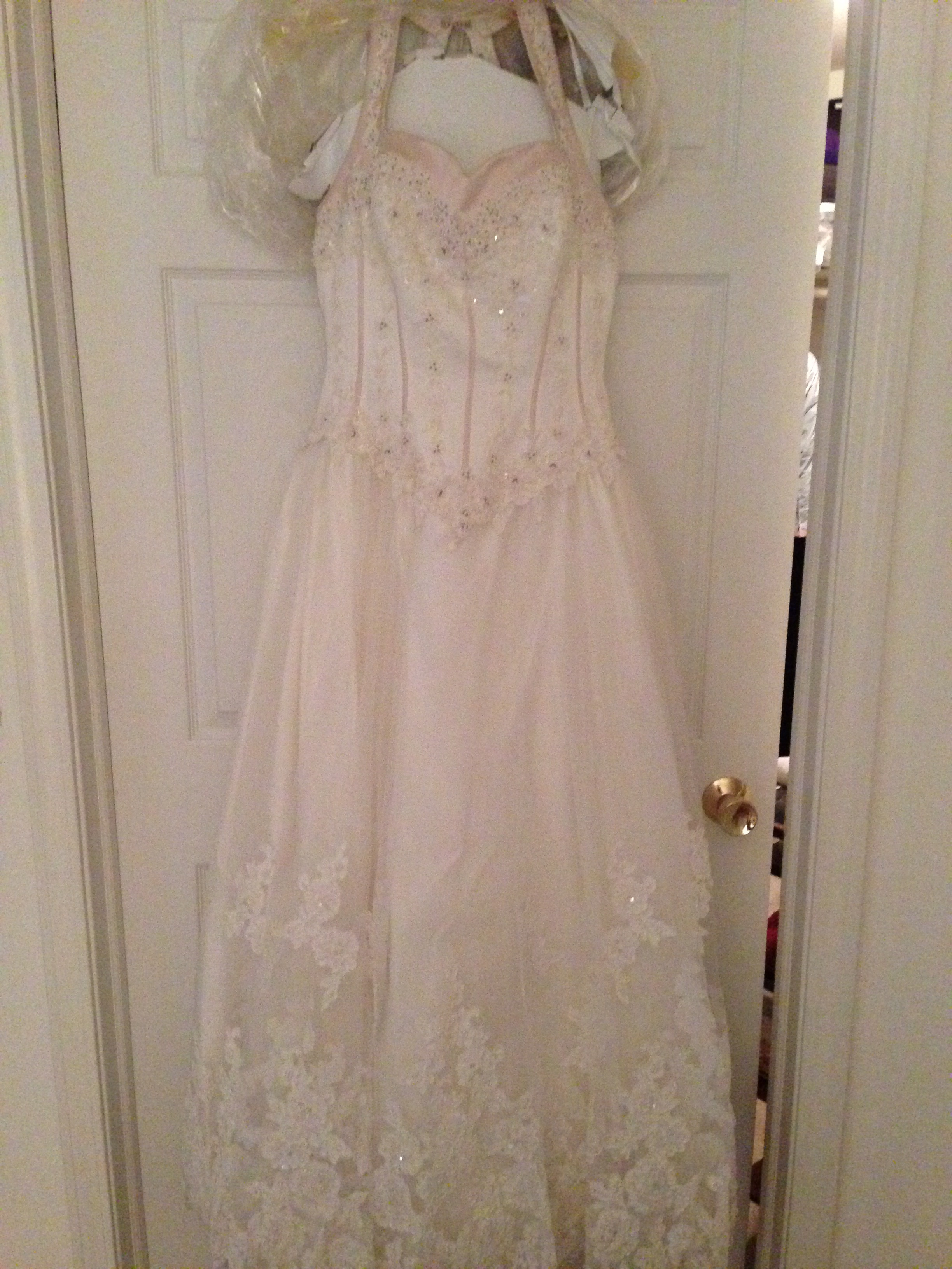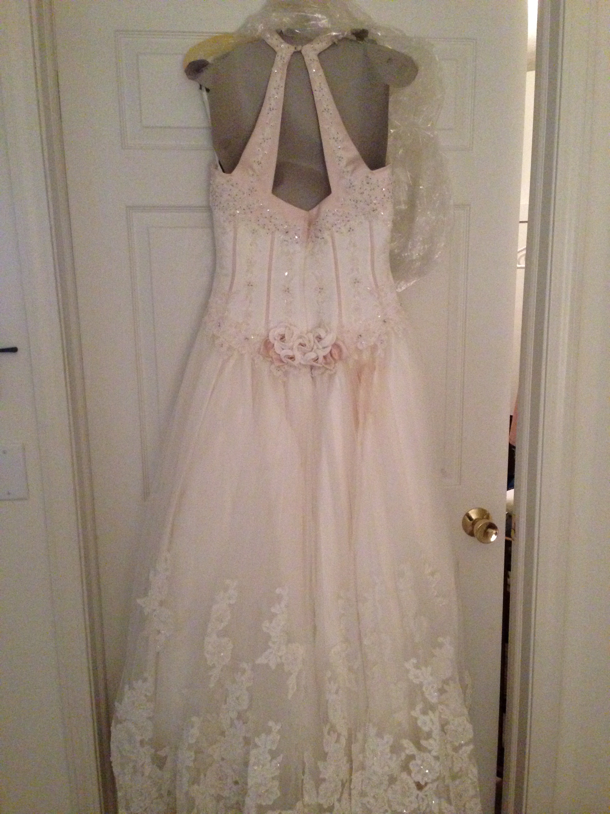 Beautiful Mon Cheri wedding gown. Seen on Friends as Monica's first dress. Champagne pink trim with beading over bodice and full skirt. Detachable train. size 14 bust. $750.00 OBO. Please contact Jess 267-809-1022