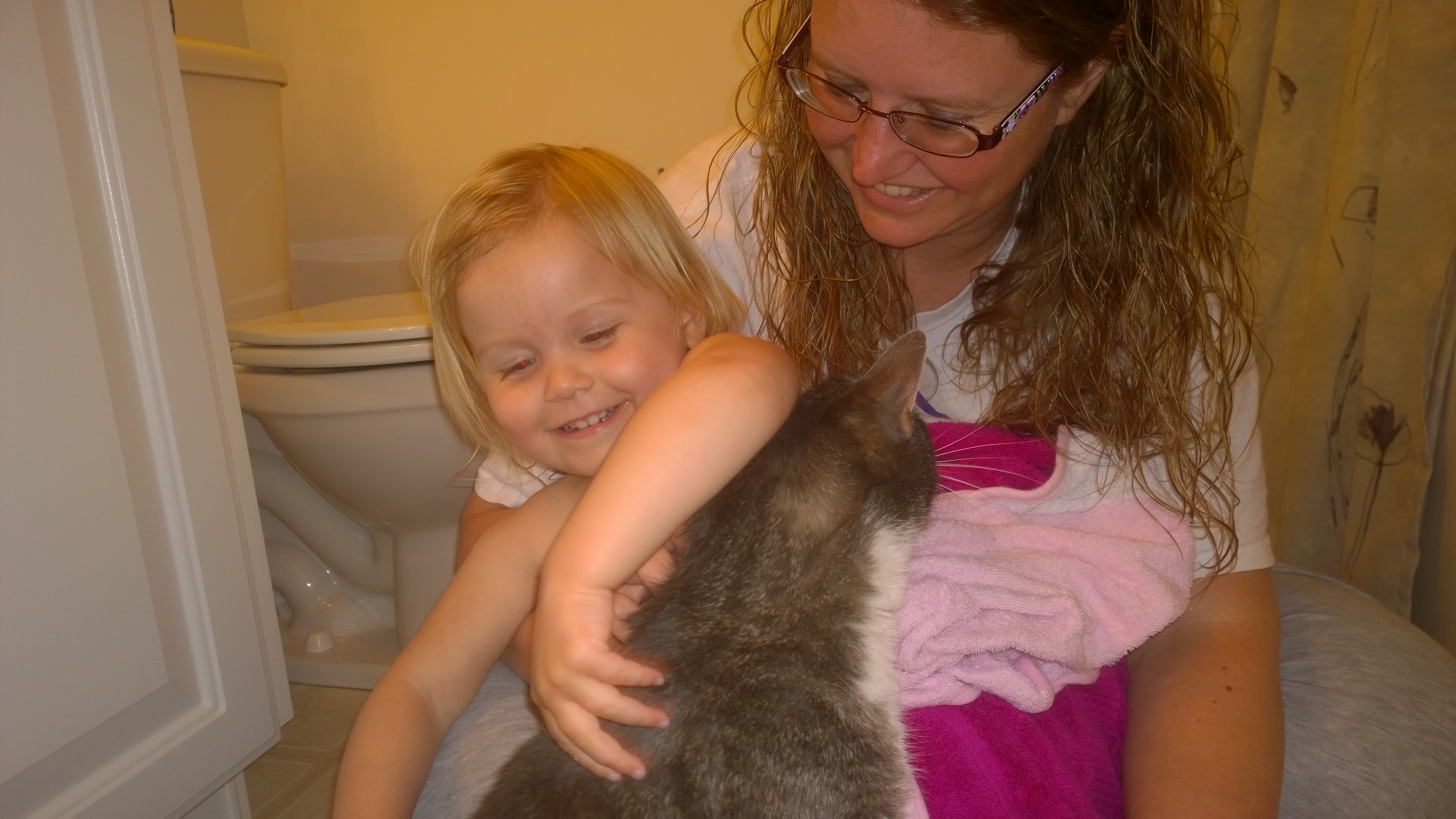 • M and Spike. He was so scared of her and it makes her smile so.big that he comes around. They have a night cuddle session after bath time.