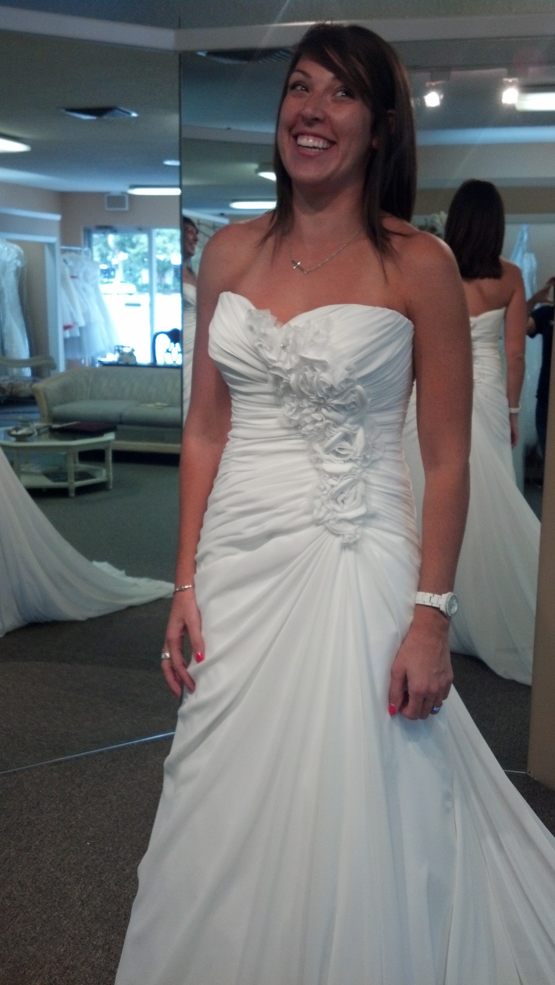 I bought this dress while planning my wedding and it was already halfway in the process of being made when I found out I was pregnant. I have NEVER worn the dress. I literally picked it up from the bridal shop in the bag. Like i said, it has never ever been worn. Brand new Size 10, I am 5'10 and normally wear a size 6. Beautifully draped, this slim A-line of soft, luxurious Georgette Chiffon features a sweetheart neckline and handmade flowers kissed with Swarovski crystals cascading down the bodice. With this gown, it's all about fit and femininity. Finished with signature corset back closure.Orginally $950, I am asking $800