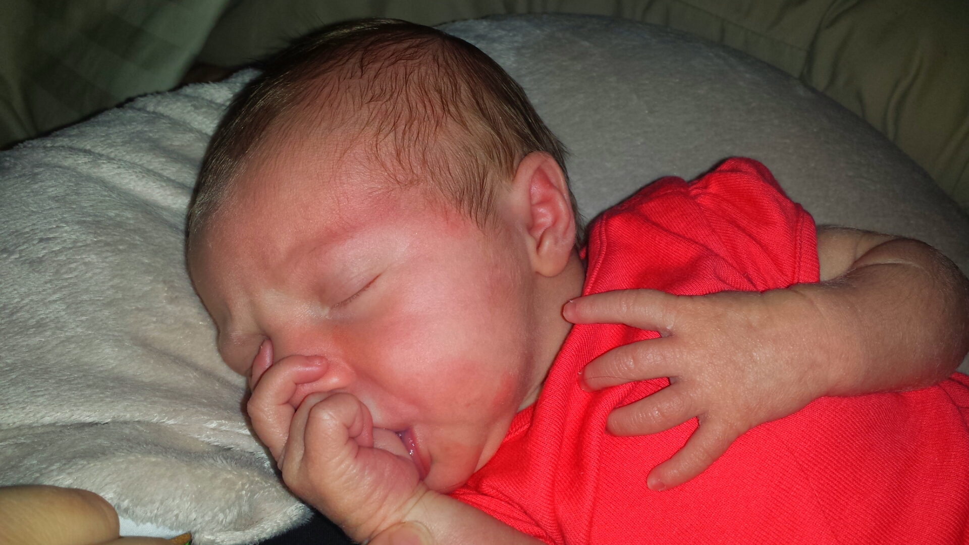 • E is almost back up to birth weight. She was 7 lbs 7 oz, at her appt Monday she was 7 lb 6 oz. She also projectile pooped on the nurse while she was getting her temperature. I was a little shocked and embarrassed. Everything else looks good. She's found her thumb and tries to stick it in with my boob while feeding. Doesn't really work that way.