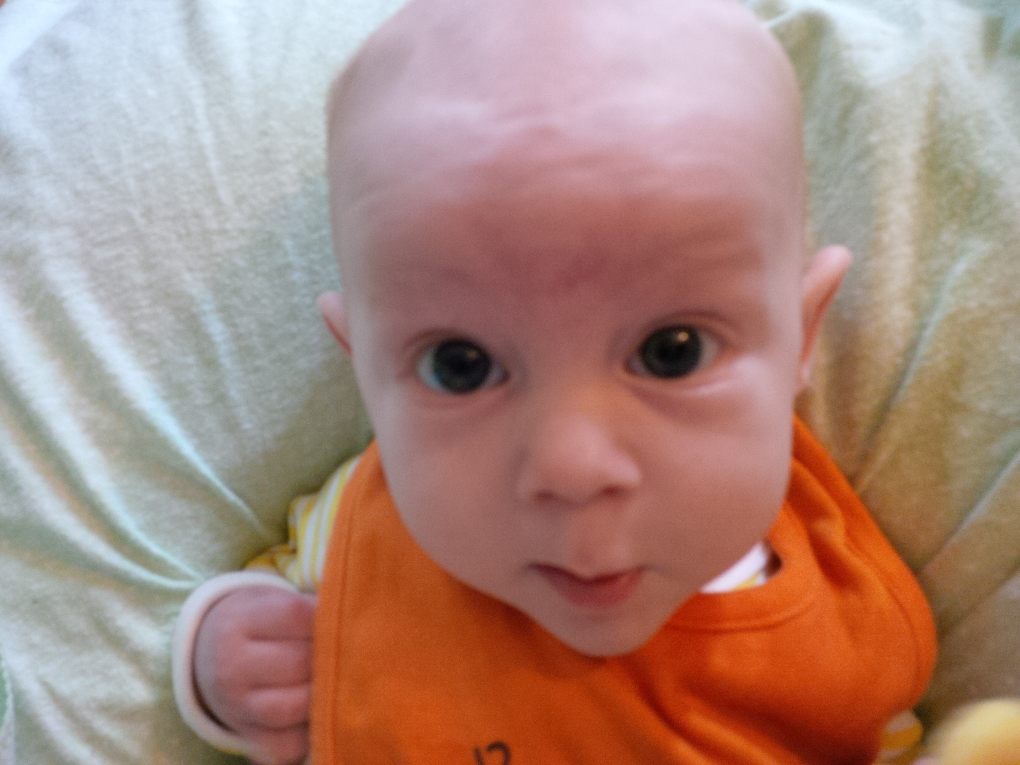 Rants/Thoughts/Baby pics?yesterday as I was dropping T off at daycare I noticed his head and torso were covered in a rash that wasn't there 5 mins earlier when we left the house. We raced him over to the Drs and they were unable to tell us what caused it. Luckily it was not affecting his breathing. The initial rash was gone within 2hours. It came back a few hours later but on his cheeks and arms/legs, exact opposite of where the first rash was! It could be viral or could be an allergy to milk protein as we supplemented a little with formula over the weekend (he's not really gaining any weight). Poor baby is on prednisone now which is miserable for a baby. We go Monday to allergist (my best friend) to have him tested for milk allergy. Both her and the allergy physician believe it sounds viral.i just feel so bad for the little guy!