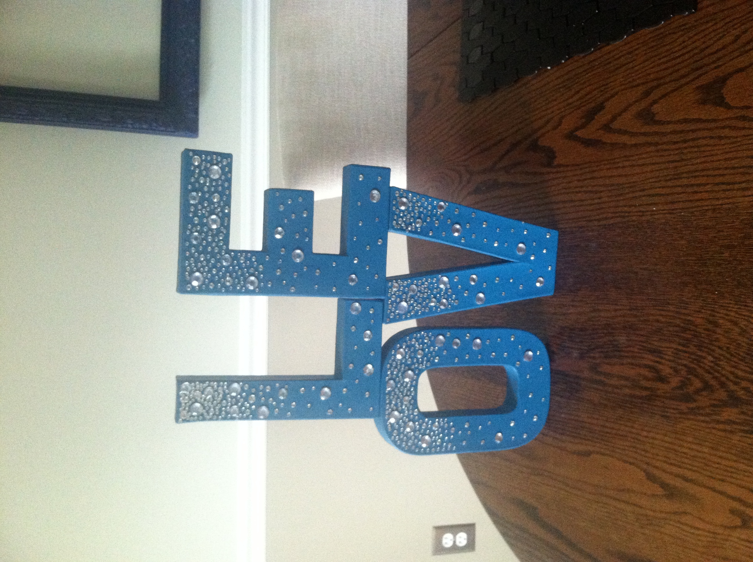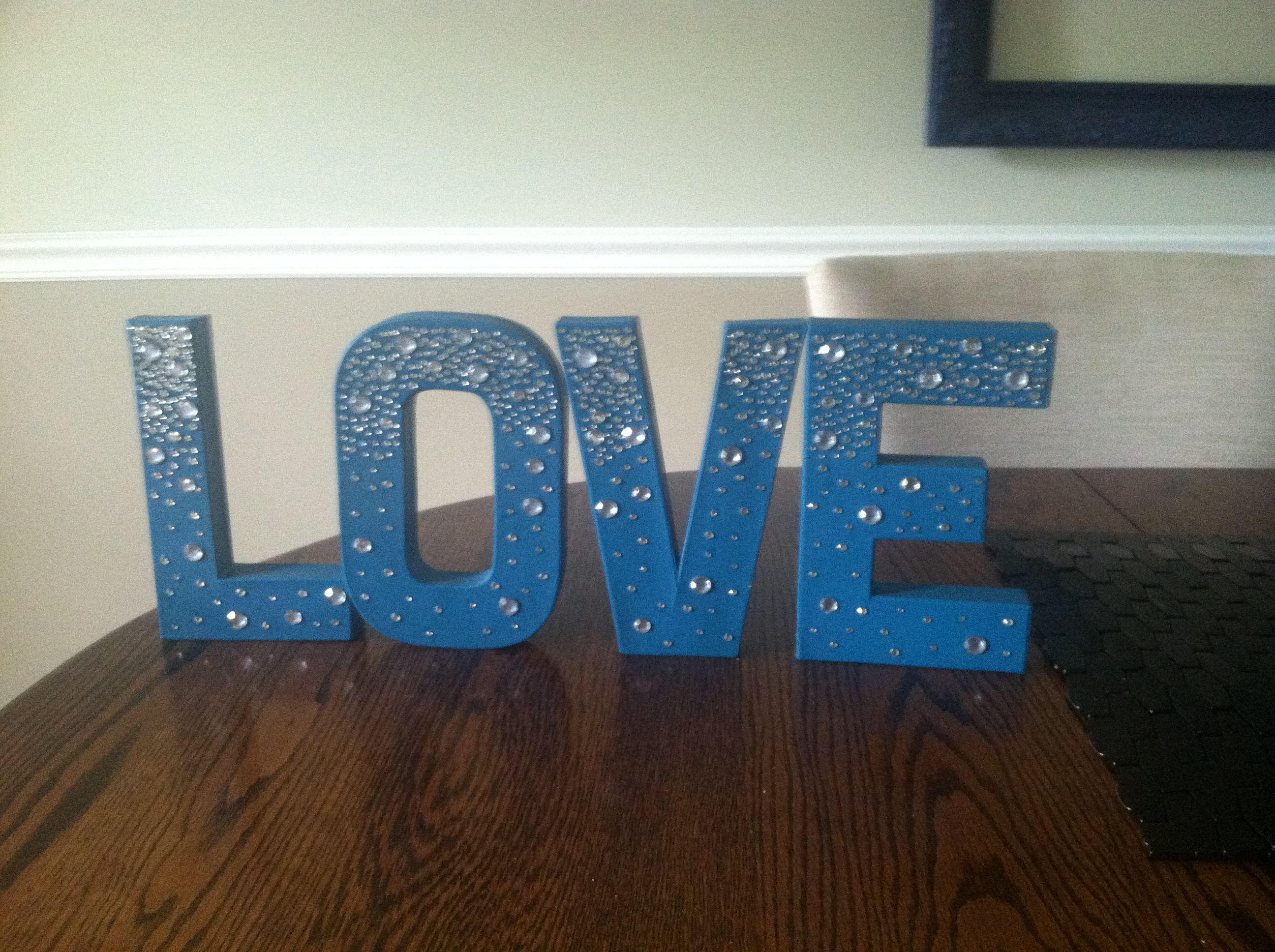 Cardboard letters, spelling LOVE, were painted & bedazzled with tweezers & a lot of love. Put this sign on the bar or on a table at your wedding to add glitz and a touch of DIY glamour!