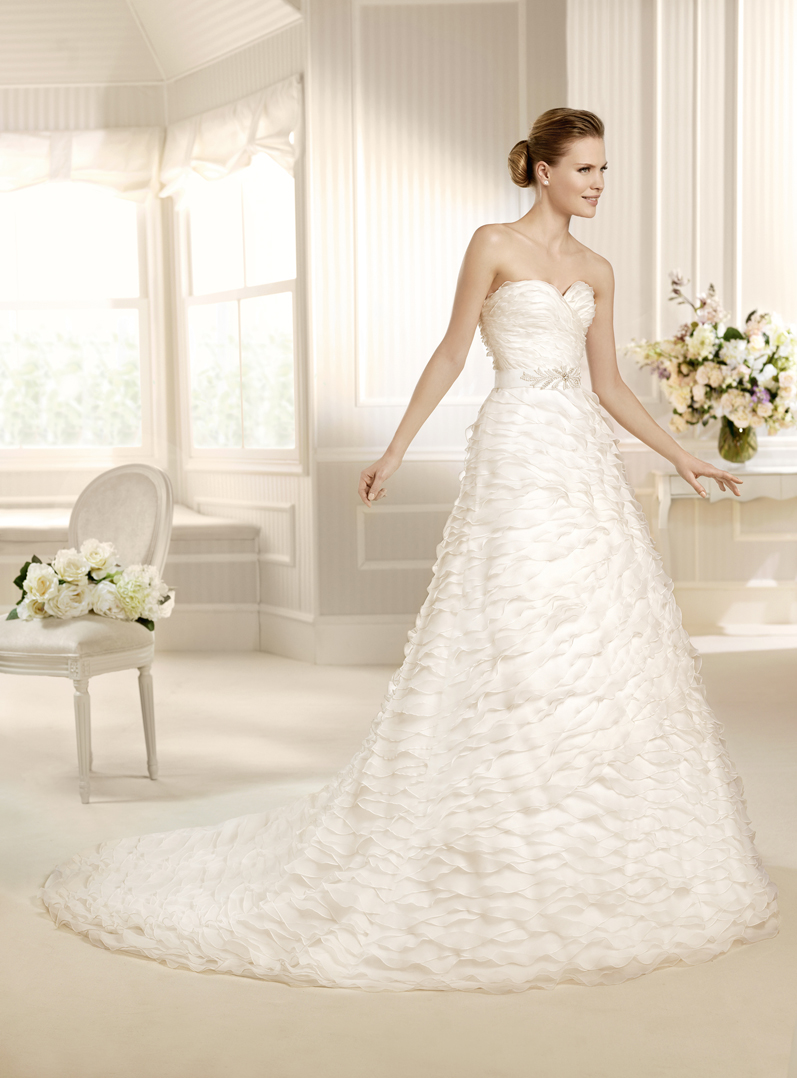 Dress: Strapless with a sweetheart neckline Paris Garza A-line layered gown with jewled grosgrain belt at the waist (included).