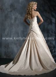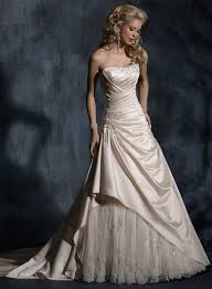 Maggie Sottero Brittney wedding dress - light gold color. Absolutely stunning with beaded bodice, fitted ruched top, A line cut and beautiful peek out lace embellished bottom. Size 6 (I am 5'3'', 115 lbs). Lace up back for adjustable fit on the strapless dress. Purchased in 2014. This dress was worn for an indoor wedding and is in great condition. No stains or marks on it. Very comfortable dress, while still being a statement piece. Comes with bustle in place.