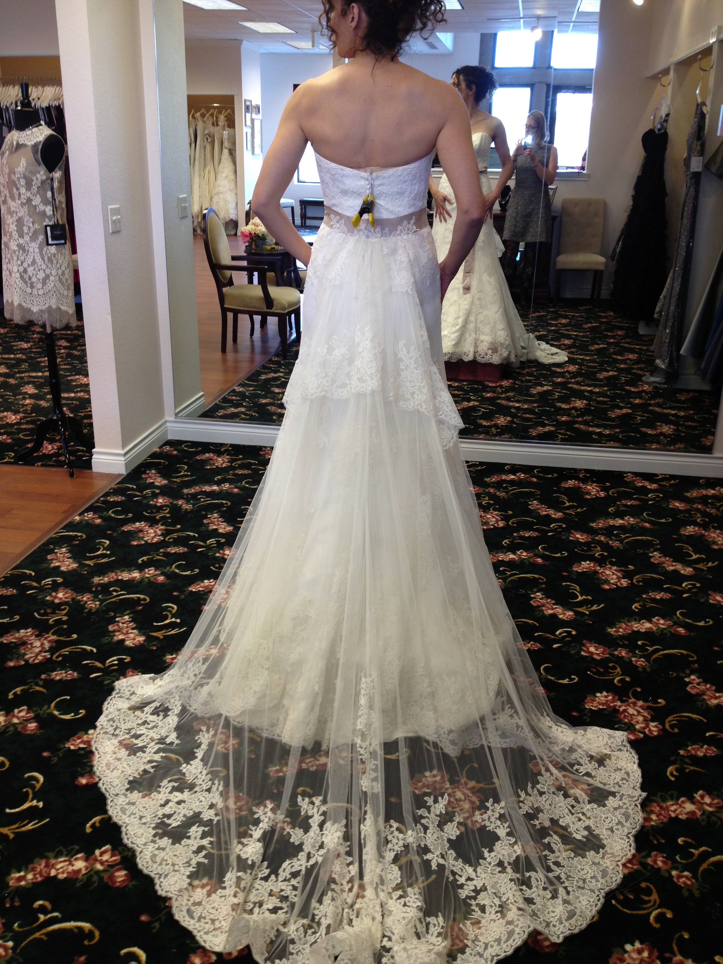 This beautiful Sottero and Midgley Celeste dress with detachable train (#711533DT) retails for $1450 and was purchased NEW for a total of $1618.51 once all was said and done. The color is Ivory (leaning more towards soft white) and the sash attached to the detachable train is in the color Parisian Mist. This dress is brand NEW, UNUSED, UNWORN, UNALTERED. The dress sells for $1100 and the detachable train is $350 by itself alone. It's killing me to sell this dress, I LOVE IT, but we are now having an outdoor wedding in the mountains on rugged terrain so this will no longer work. Original receipt, certificate of authenticity, and garment bag included. Selling for $995. Please inquire for more photos...train is included. The personal photo of me is in the sample dress of this model I tried on. I wanted to give a real life pic of what it looks like. The dress I am selling is brand new, never even tried on. A size 12 fits: 39" Bust x 31" Waist x 41" Hips. Street size is more like a 10. I'm actually a size 8 but wanted to give myself some breathing room just in case my weight fluctuated and my seamstress assured me that the dress could be sized down 2 sizes easily. I'm also 5'10" tall and this dress is long enough for me with room to spare.