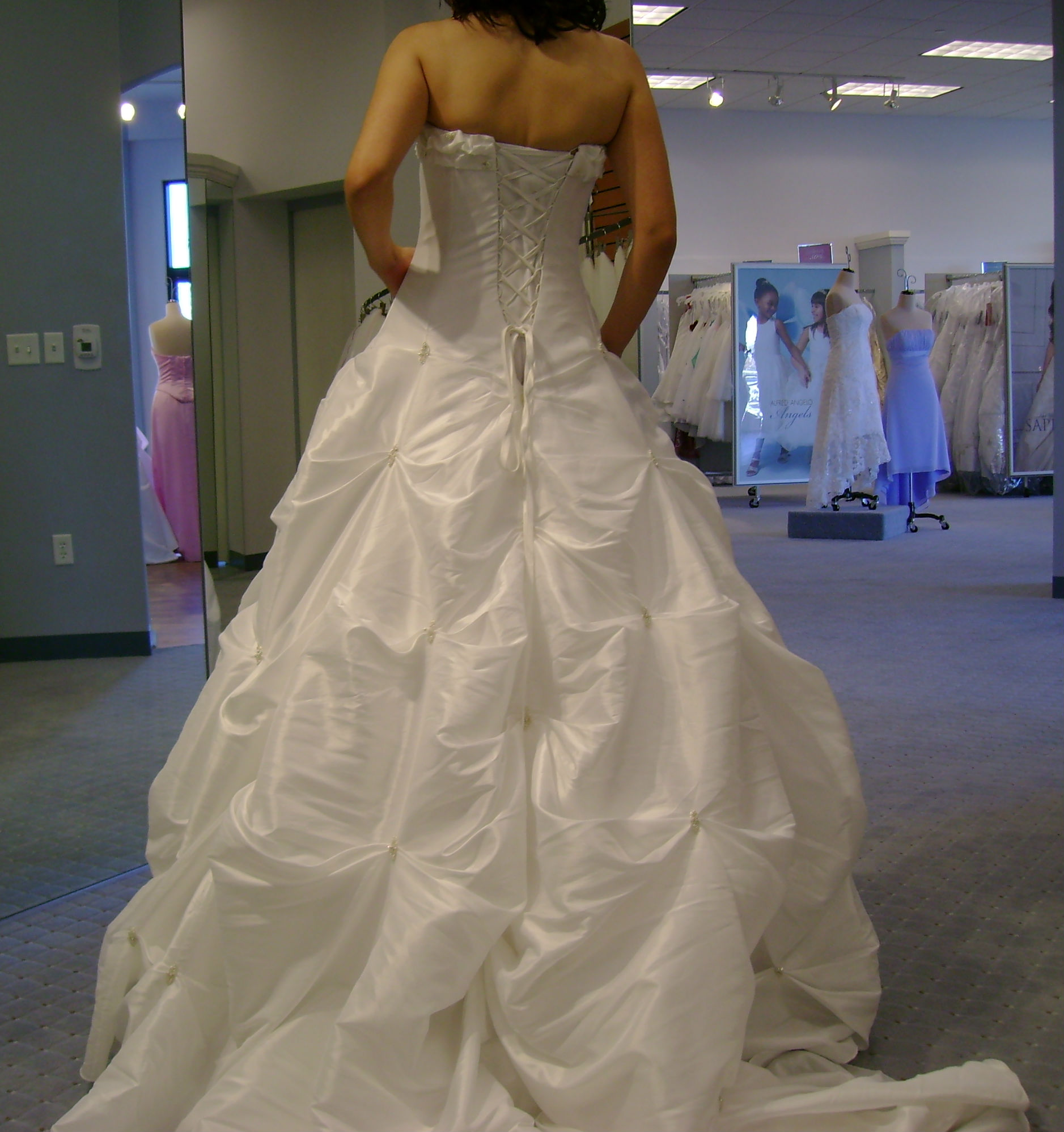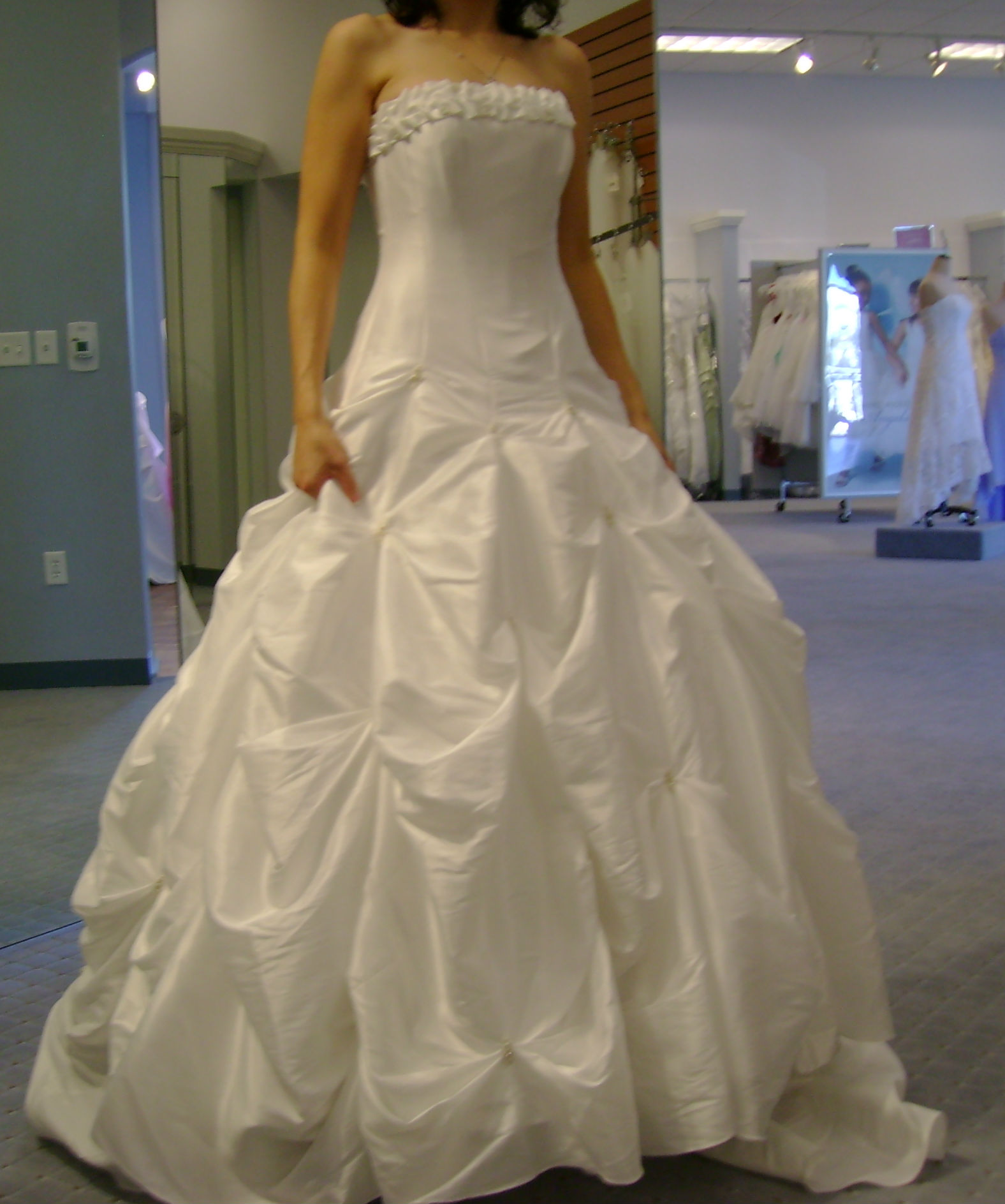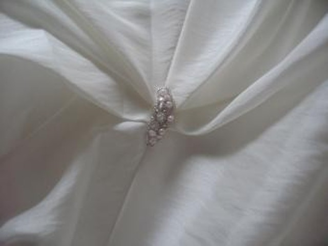 Gorgeous! The style number is RII6. It has an inside corset that can be adjusted by tightening the laced-up backing. Several embellishments throughout which consist of pearls and rhinestones. The skirt has gathered sections like a Belle gown. The gown has several layers of slip underneath, some that are tulle. It has an attached train that can be buttoned up into a bustle with three support buttons. I did add several hooks in this area to make sure the train stays hooked. It was only worn once for about 5 hours. I have had this dress professionally cleaned and stored in a keepsake box since right after the wedding. It is in perfect condition. The pictures shown are from when I first purchased the dress and how the dress is currently stored. The dress was originally $900 and I'm currently asking for $750. Please contact me for more questions. I'm in Las Vegas, NV and can meet to deliver.
