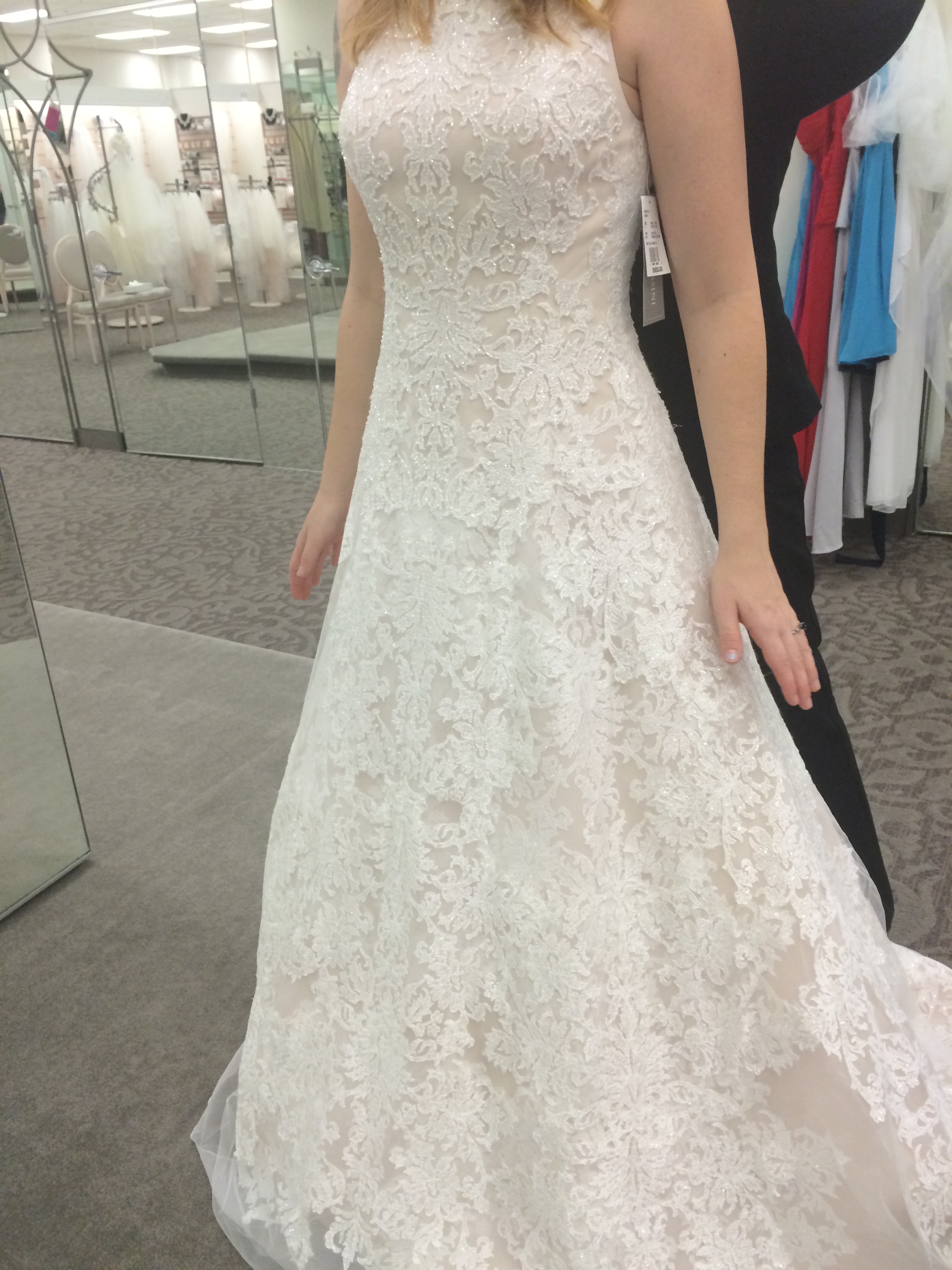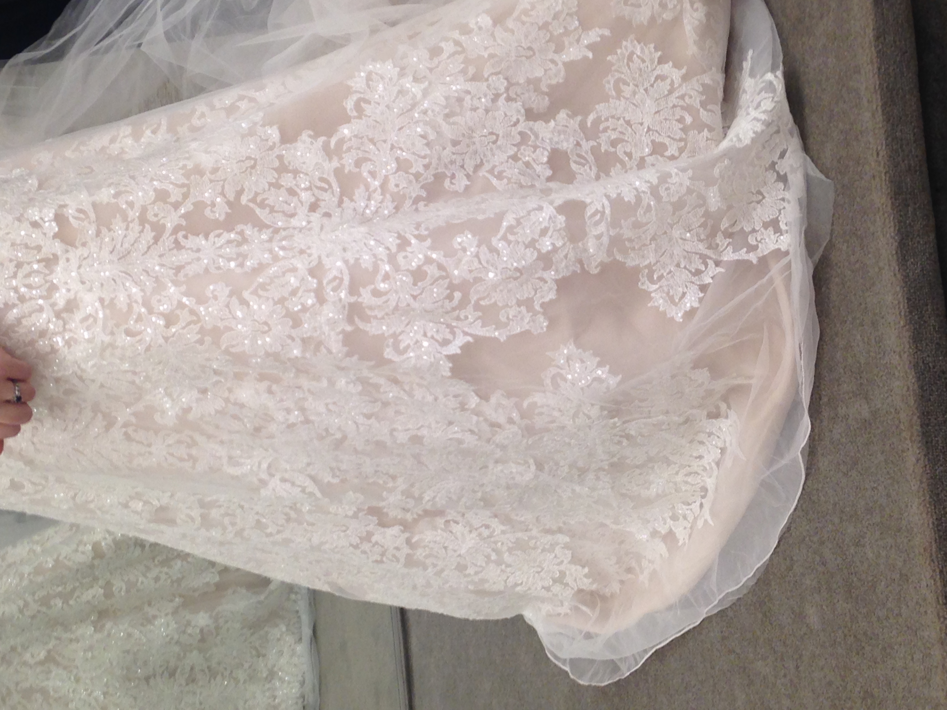 I bought this gown on impulse, and as absolutely stunning as it is, I feel that it just isn't "ME." It is beautiful and I have only tried it on once since I received the dress. It is UNALTERED. The lace detail is amazing. This dress is still being sold at the store (Davids Bridal) if you want to try it on first!
