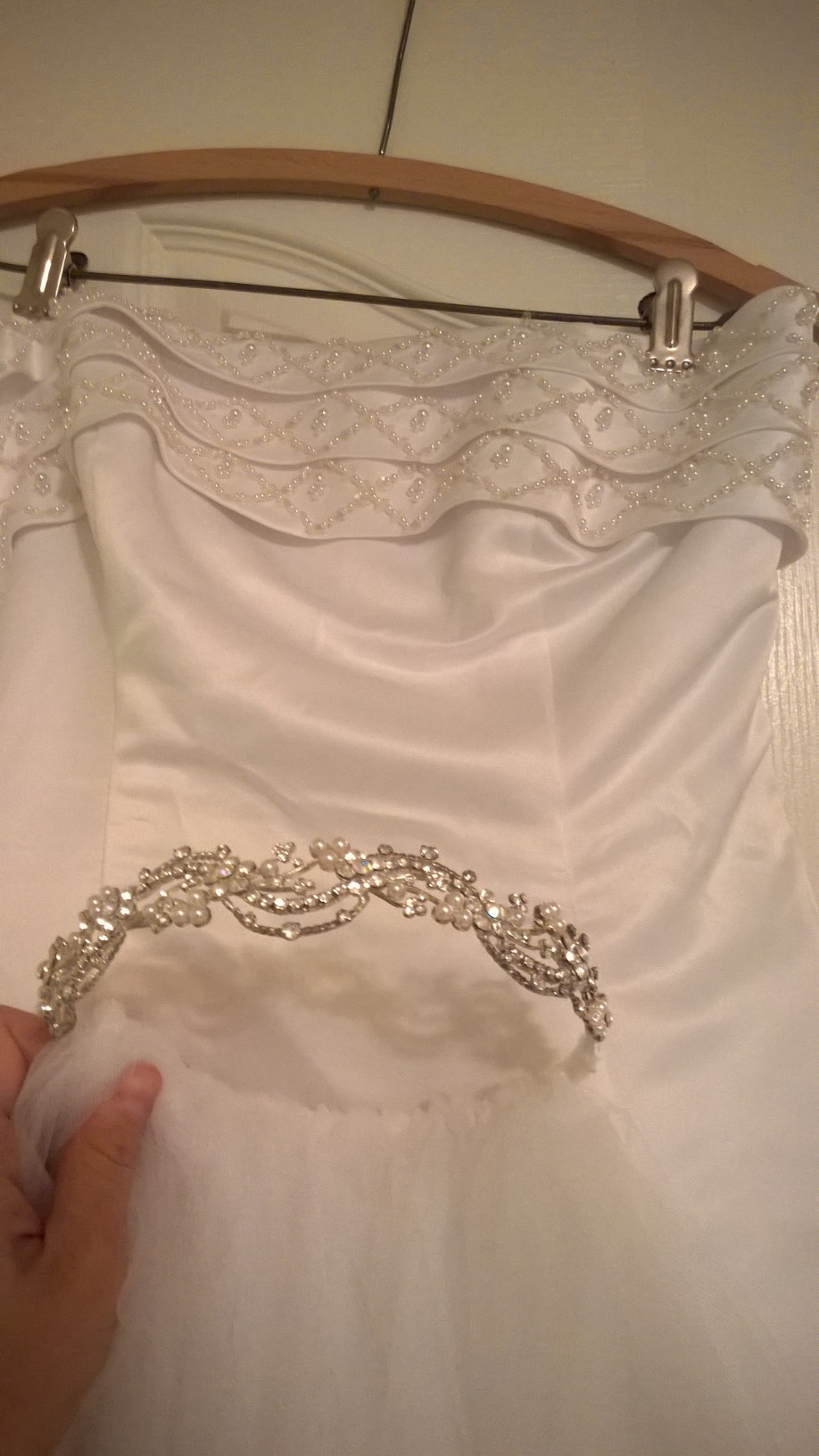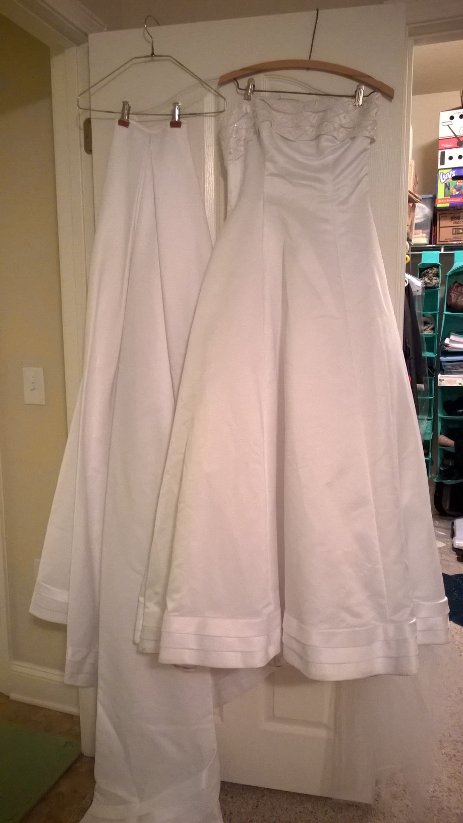 Size 10, white, has a fully detachable train. Beadwork only on the bust and ribbon lined on the bottom. I will include the headpiece that also has a detachable veil.