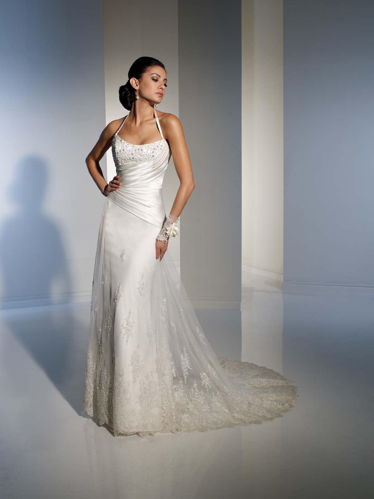 Features a scooped halter neckline highlighted with hand-beading on delicate lace throughout the bust and draped satin across the asymmetrically dropped waist bodice.