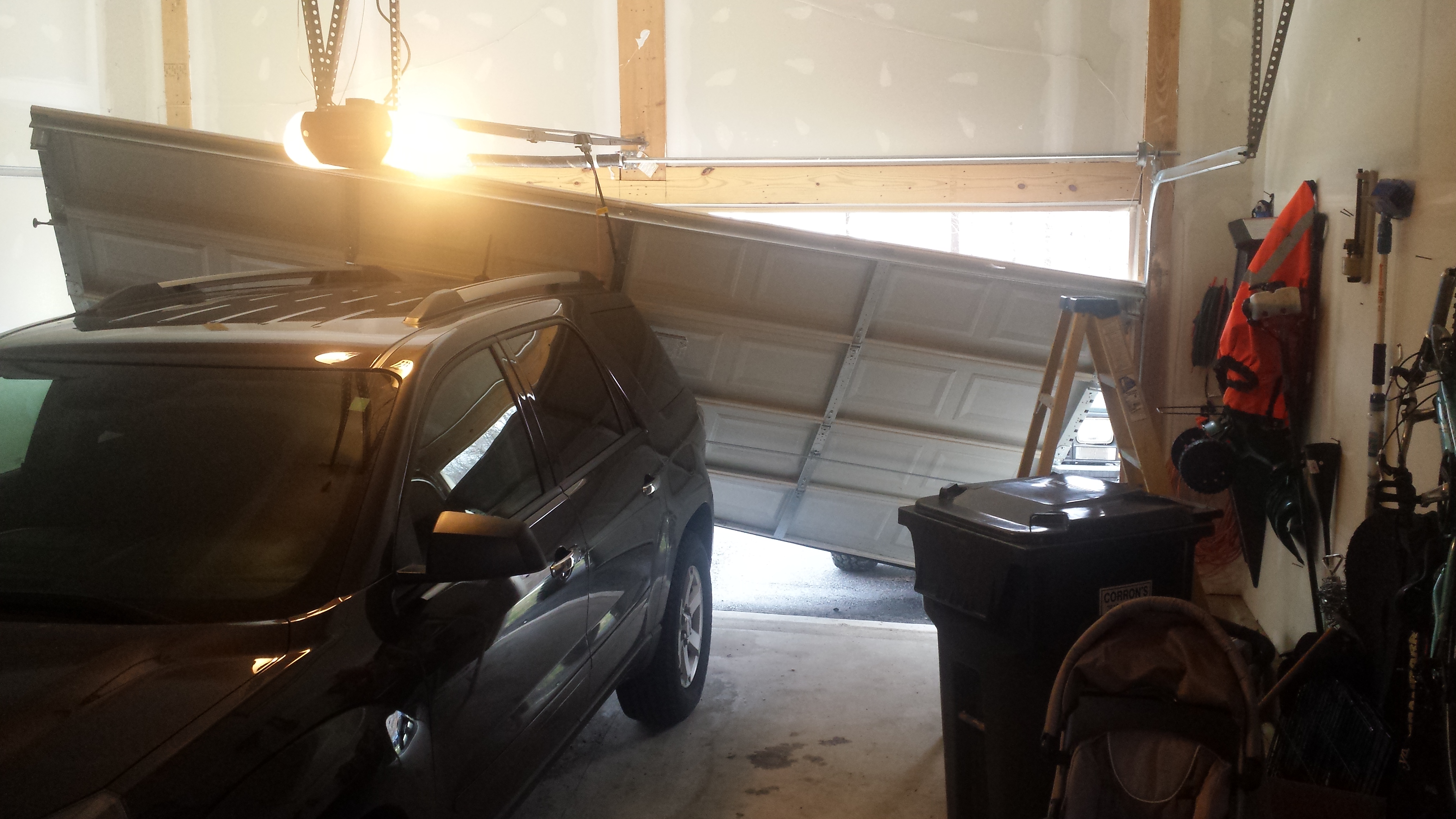 It's been being weird for a while now.  It wouldn't go down Friday afternoon, but dad and Jeff "fixed" it.  It went up and wouldn't go back down again.  I'm an idiot and put my car in it and Dad and I tried to get it back aligned.  Got stuck.  Dad went home and said he'd come back to help Jeff if he needed it.  Jeff woke up and I asked him to look at it.  He got so PISSED (whole other story) and next thing I know, the garage door is on my car.  We got a repairmen to come that night to fix it, and he's redoing the whole door system today.