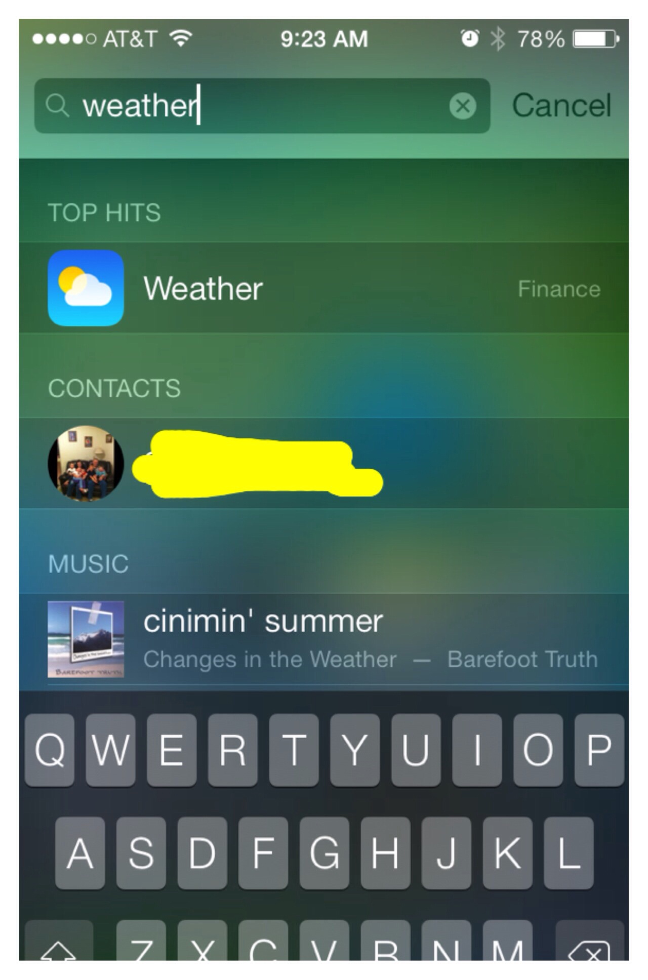 To utilize the search function, slide your finger down the home screen and the search bar will pop up at the top (make sure you start sliding from the middle, if you go from the top it will drag down the notification center). Search "weather" and voila :)