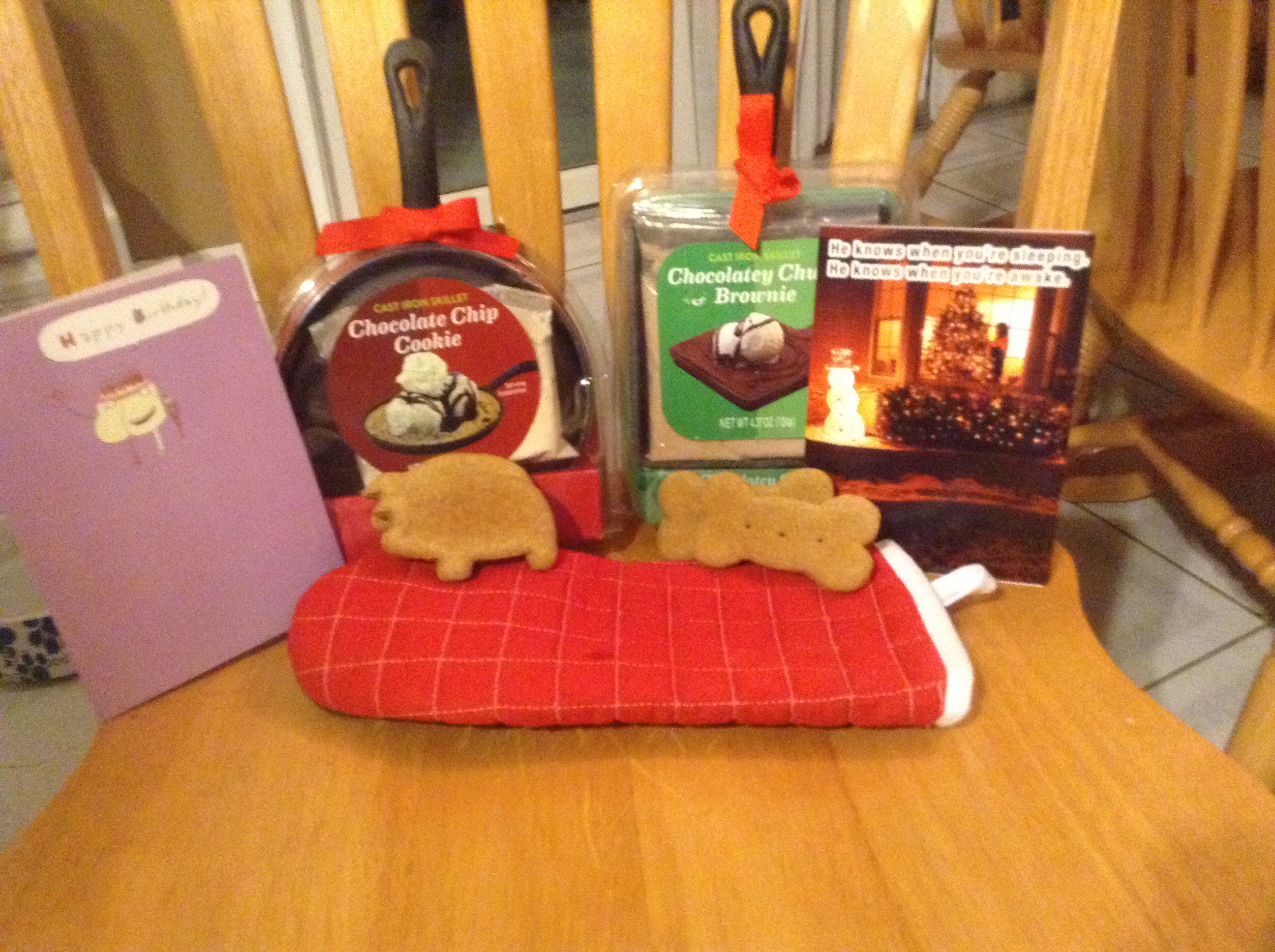 First of all- the card. I read the front (He knows when you're sleeping. He knows when you're awake) and thought to myself, wow- Santa is a little creepy! Then I open the card, and cracked up when the inside said 'not Santa, your creepy neighbor with the binoculars' haha. I an so excited to use the cookie and brownie skillets, with the new oven mitt, of course!