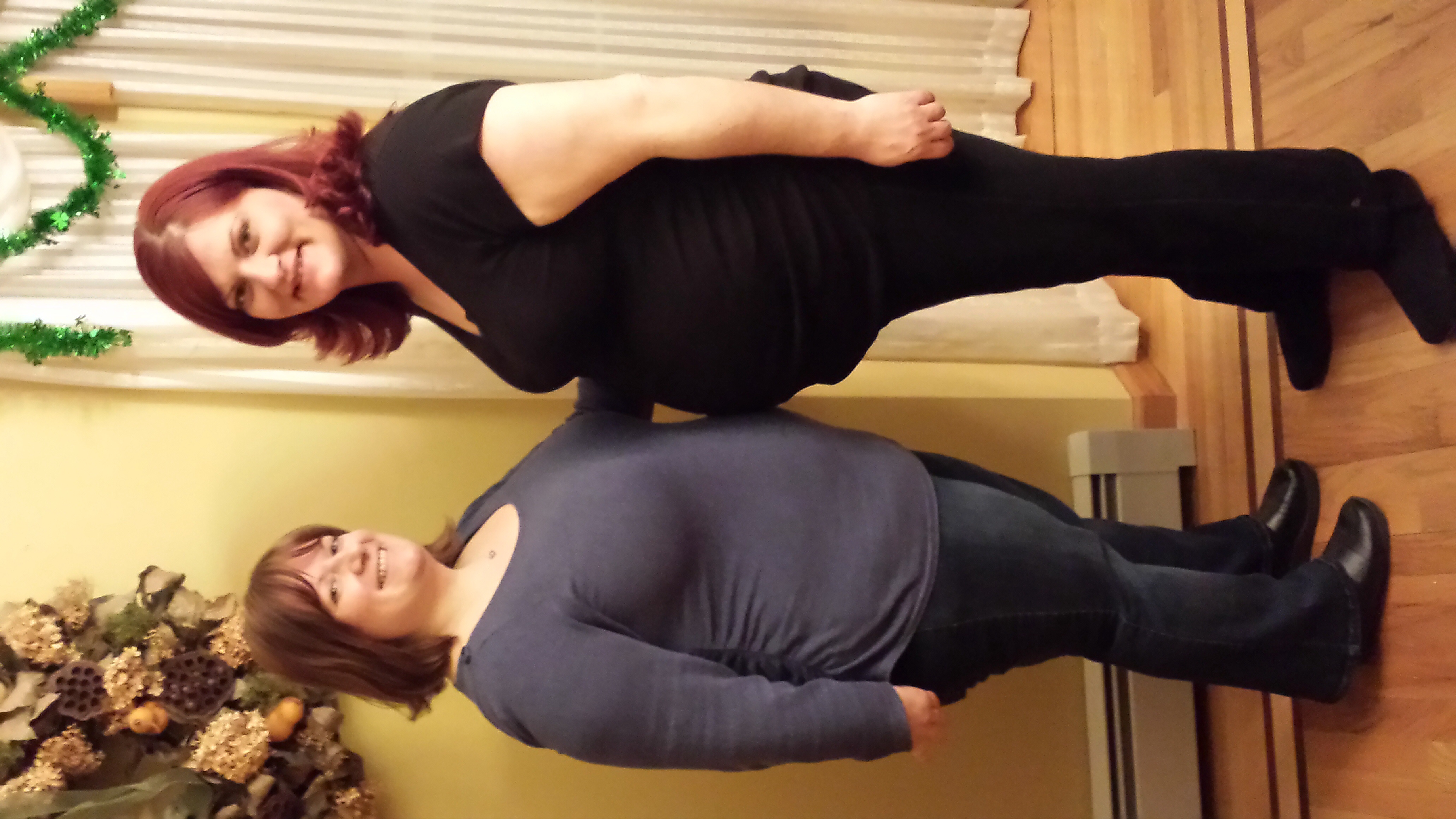 Rants/Thoughts/Bump pics? I posted a pic of me and my sister in law on Facebook and I'll post here for those that didn't see it. We are due a week apart (she's after me) but she is also a foot taller then me so I look like a short frumpy midget next to her!!! I also look so exhausted since this was at 9 pm and I had been at my inlaws since 10:30 am!!!