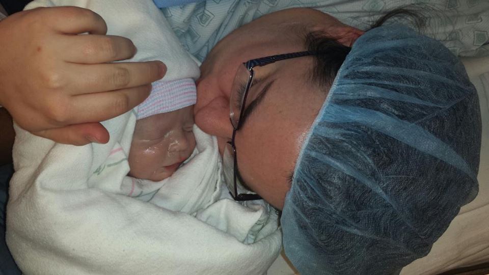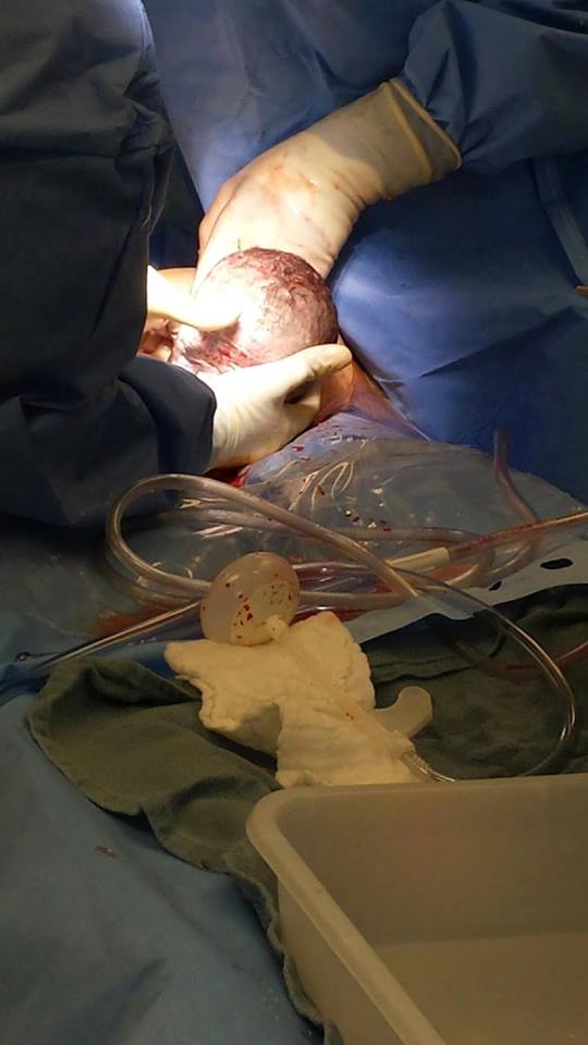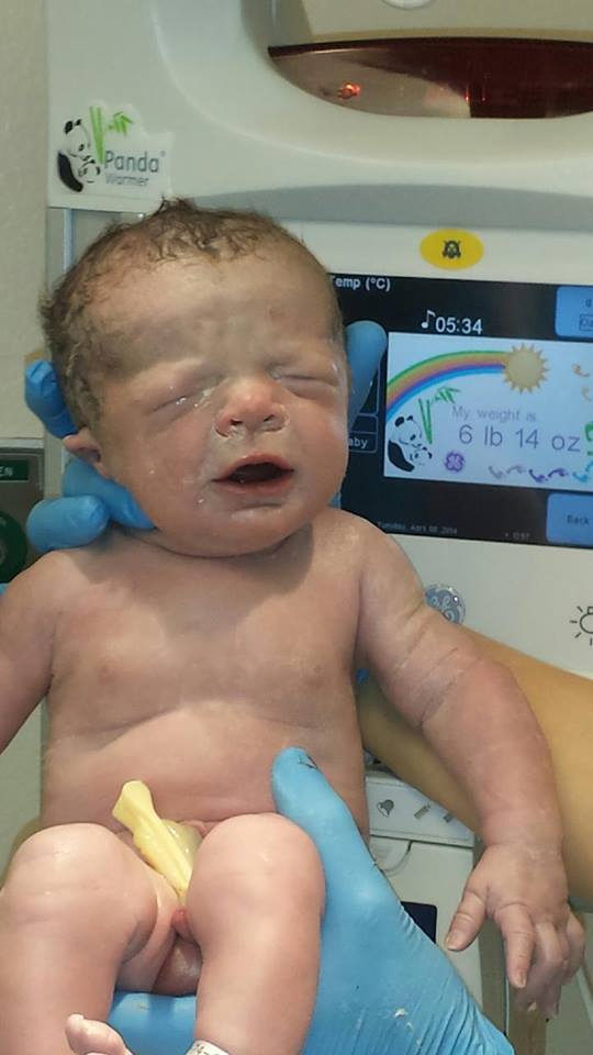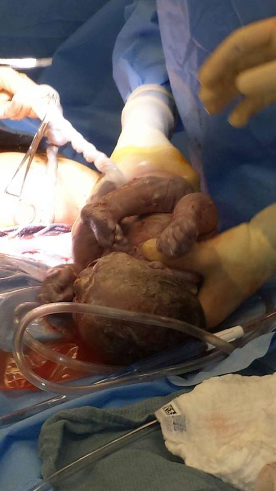 The surgical resident, my MFM, a nurse, the anesthesia resident and the anesthesia lead all tried to calm me down and ask me what was most scary. My response “it’s all scary!” to which they said but what part is most scary? Me – “all the parts!”. I climbed up onto the table anyways and buried my head in the chest of the nurse while my amazing MFM (Dr. McElrath) and the surgical resident rubbed each of my shoulders and held my hand. It took them at least 5 tries to place the spinal. Basically you never want to hear “we can’t find the exact center of your spine”. I had to tell them which side I felt shooting pain down. When it was finally placed my blood pressure plummeted and they had to give me meds to bring it back up. They had to do a lot of monitoring my blood pressure during the surgery. They got me completely prepped and called Bill in at 1:00. (He said that was the longest half an hour of his life) He sat down next to me but it felt gross to turn my head, so I was facing away from him the whole time. I hear Dr. McElrath say “incision” and smelled the cauterizing. They told me I would feel pressure and I certainly did, my shoulders were killing me. They ended up making my incision larger and vacuuming him out. They pulled him out and I heard him let out his first cry at 1:07pm. Bill and I burst into tears. That was the most amazing sound I had ever heard. They told us he had a "true knot" in his cord, yikes. Bill went over to him as they finished my surgery.