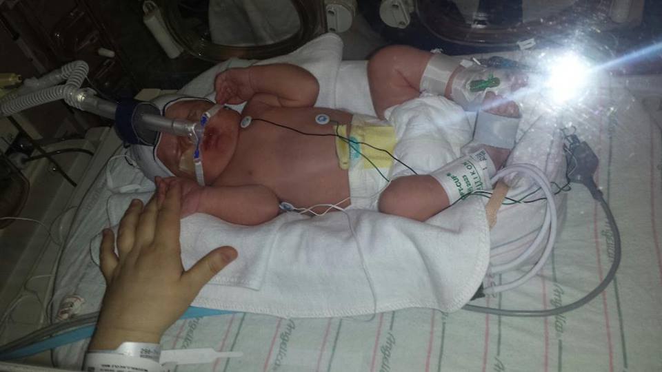 Colin Joseph M was 6lbs 14oz 20 inches long. Bill got some pictures, but then needed to come back and sit down, he was feeling dizzy, it was all so emotional and warm in there and he hadn’t had anything to eat or drink since like 7am. They brought Colin over and I got to kiss his head and tell him how much I love him, then they whisked him away to the NICU because he was grunting (trouble breathing). Bill was escorted back to the recovery room to get some juice and crackers so he didn’t pass out, leaving me in the OR alone while they sewed me up. I was wheeled to recovery and was told I needed to be able to bend my legs and lift my bum before I could go see Colin or get to my room I would be staying in. My left leg took extra long to get its act together and I wasn’t out of recovery until around 4:30/5:00. They rolled my whole bed down to the NICU so I could finally get a look at my baby. He had the CPAP, IVs and leads all over him, but he was so so perfect.