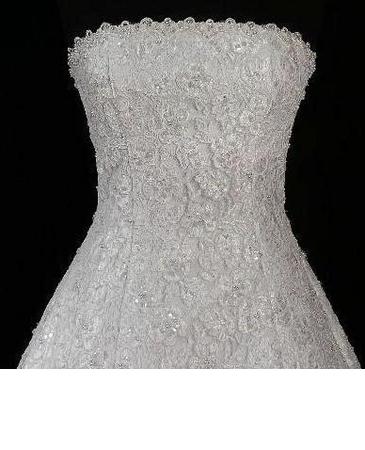 It's a Jessica Simpson wedding gown replica with a straight across neckline. It's in perfect condition and i only wore it for indoor picture and an indoor ceremony. Size 6, white, lace, and beaded. White buttons down the back.